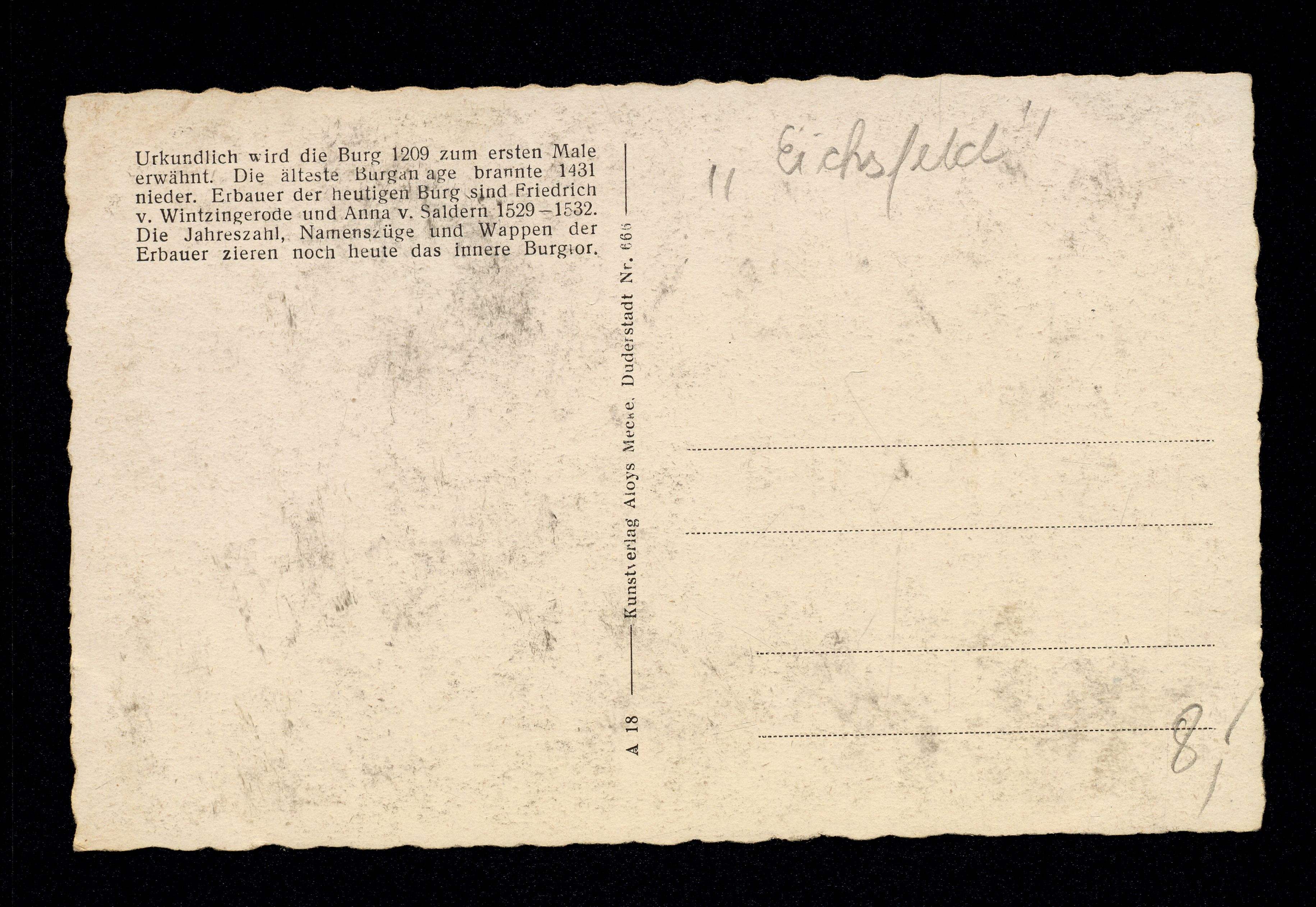 Ort Beuren Motive Burg Scharfenstein Format klein Verlag Aloys Mecke, Duderstadt Bestell- oder Individualnummer Nr. 666 A 18