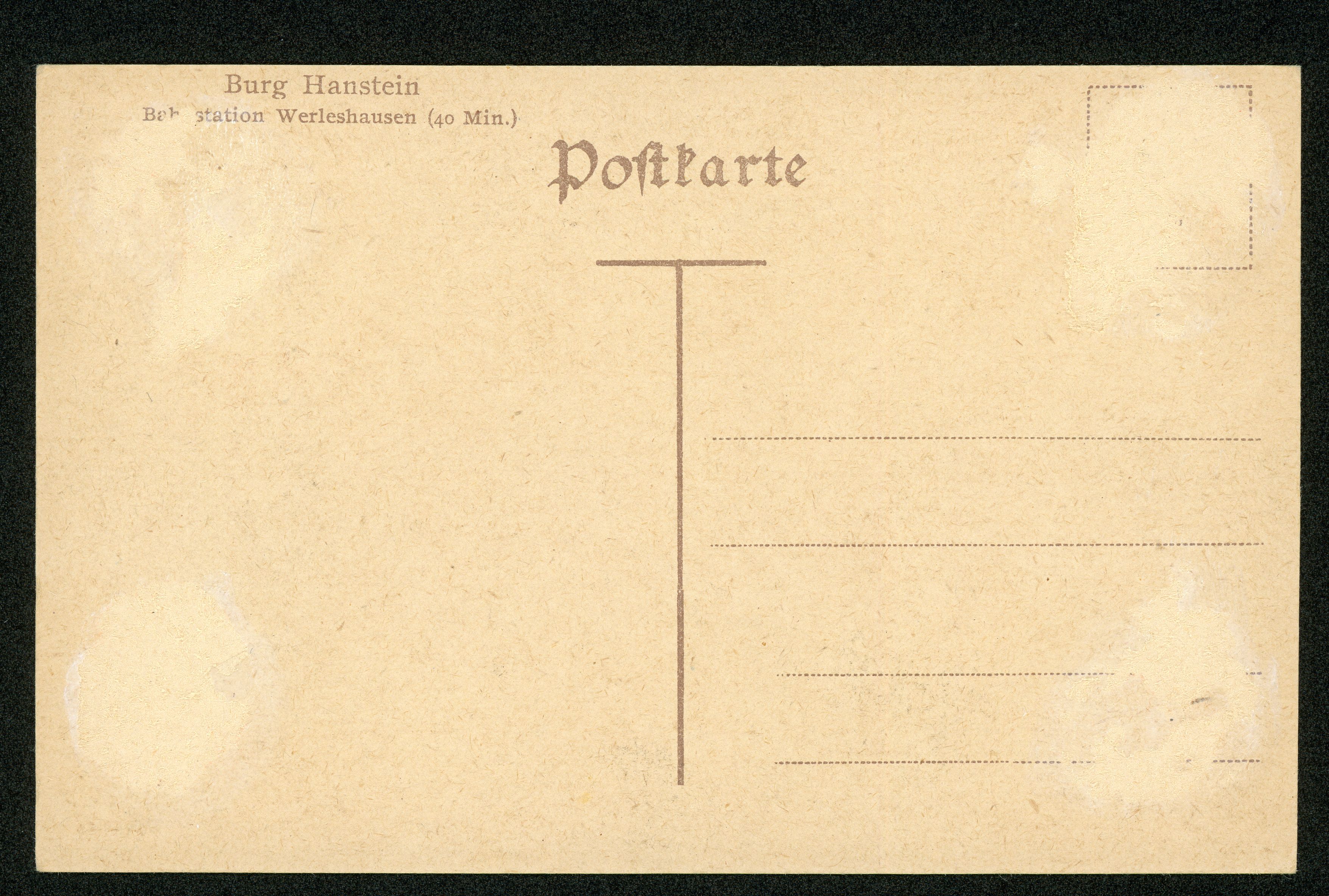 Ort Bornhagen Beschreibung Sammlung: H.M.D. Motive Blick auf den Hanstein v. S. O. Format klein Verlag H. Lange, Göttingen Bestell- oder Individualnummer ''unleserlich'' Tags Burg Hanstein
