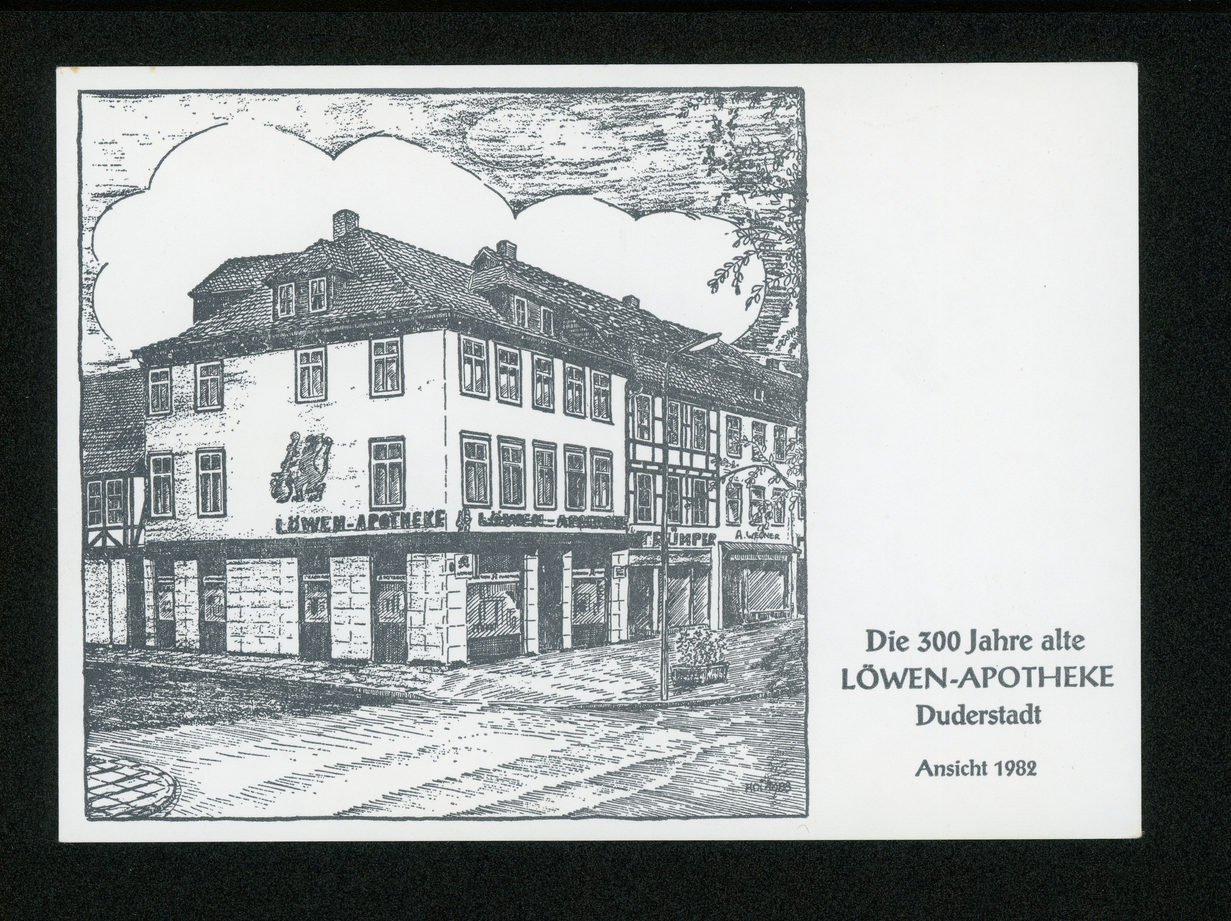 Ort Duderstadt Motive Die 300 Jahre alte Löwen-Apotheke, Ansicht 1982 Format groß Verlag - Bestell- oder Individualnummer - Tags Marktstraße, Ecke Löwengasse