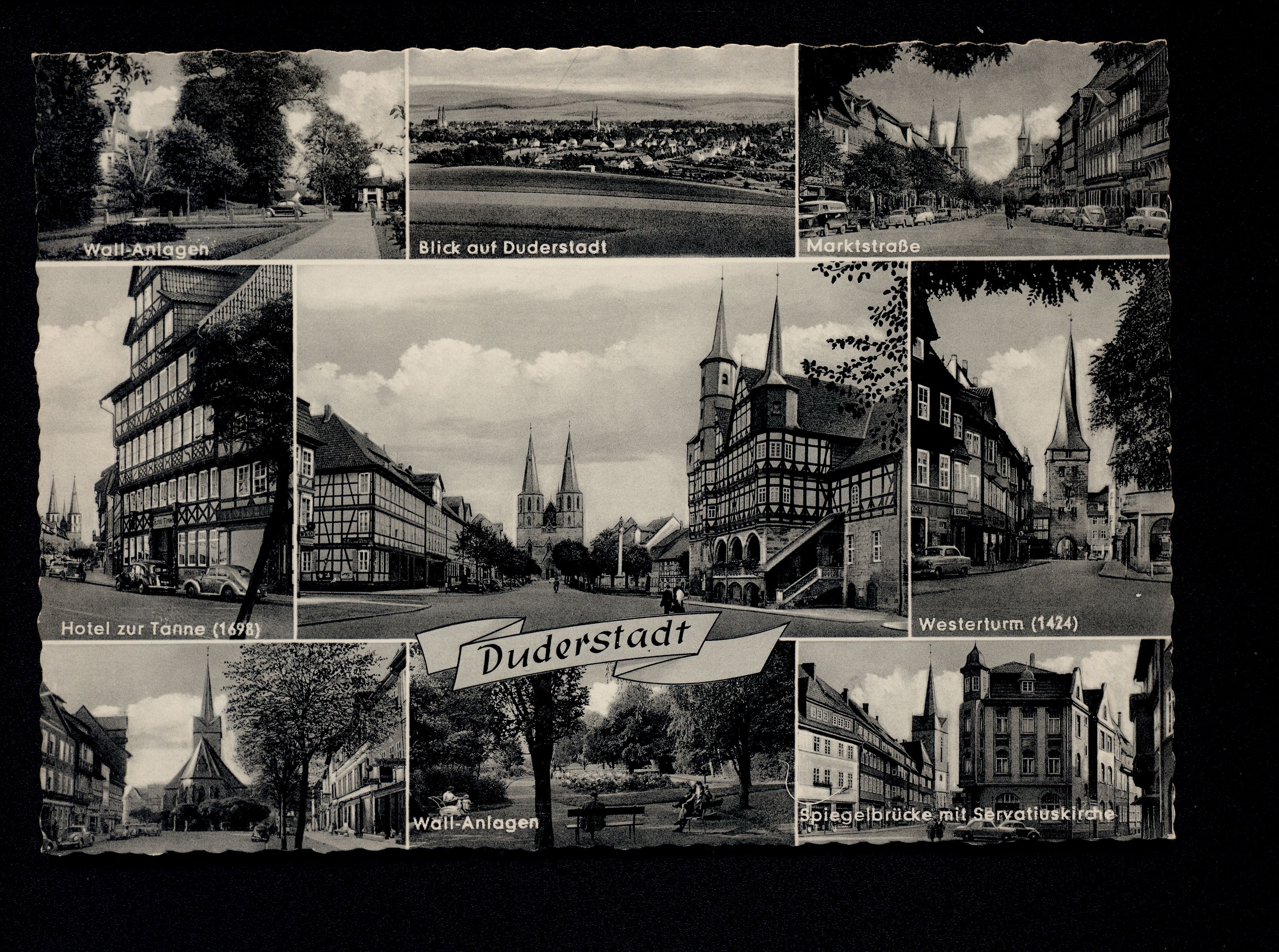 Ort Duderstadt Motive Wall-Anlagen Blick auf Duderstadt Marktstraße Hotel zur Tanne Westerturm Spiegelbrücke mit Servatiuskirche Marktstraße mit St. Servatius-Kirche Marktstraße mit Rathaus und St. Cyriakuskirche Format groß Verlag Karl Matzka, Duderstadt Bestell- oder Individualnummer CTM 23033 360/II/2560 BDD