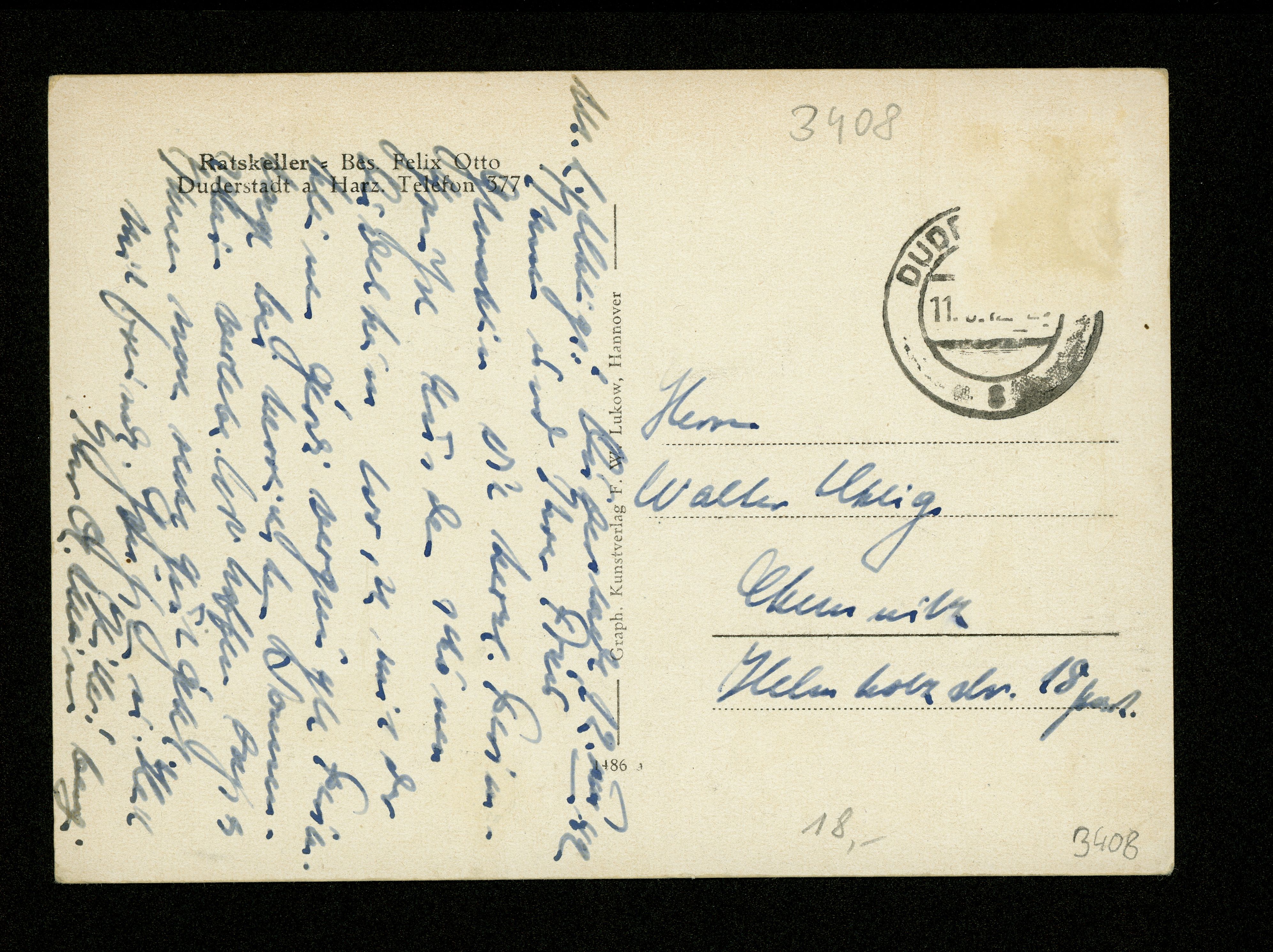 Ort Duderstadt Motive Ratskeller im 1000jährigen Duderstadt a. Harz Format groß Jahr 1942 Verlag F. W. Lukow, Hannover Bestell- oder Individualnummer 1486 Tags Ratskeller = Bes. Felix Otto Gasthaus