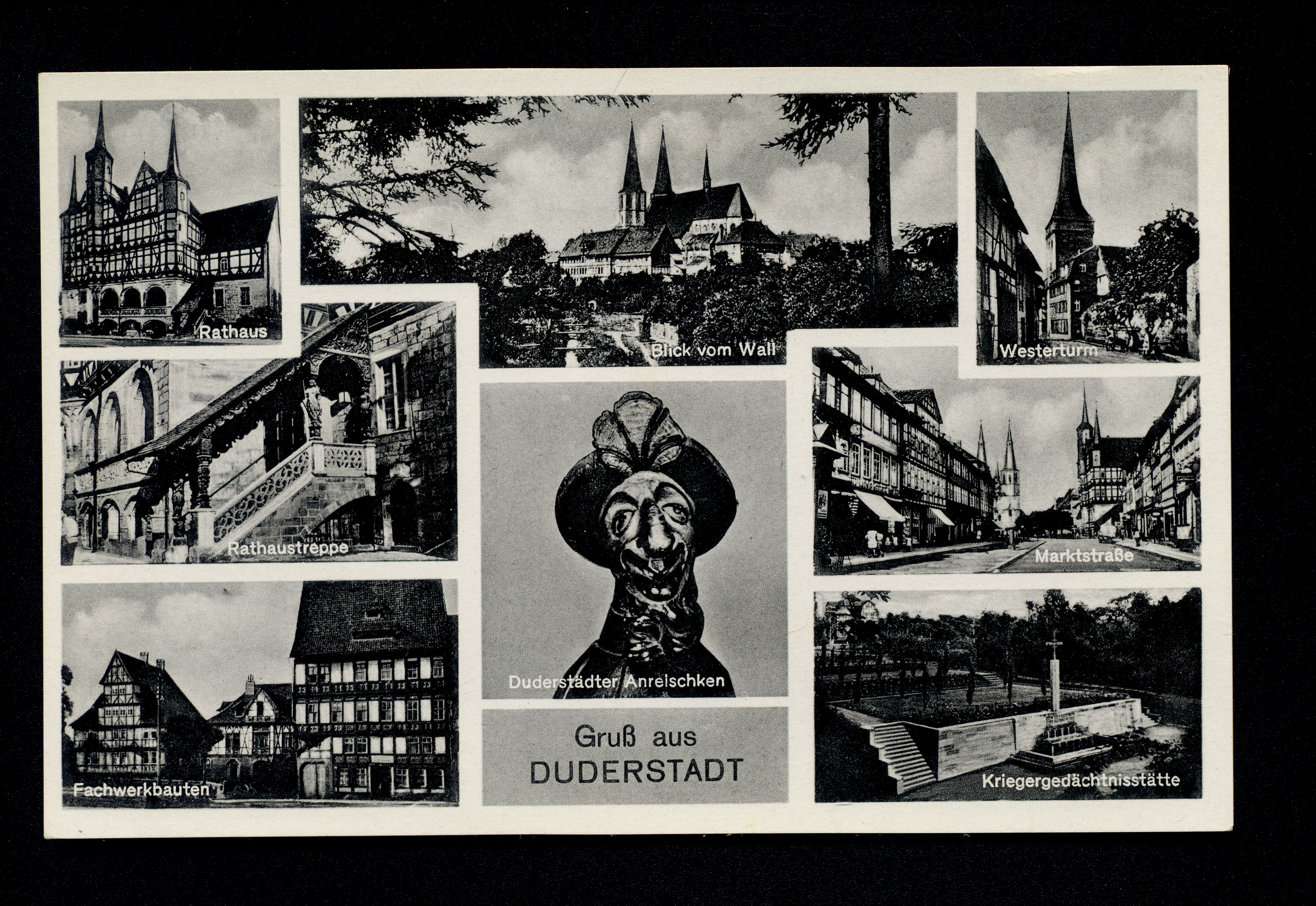 Ort Duderstadt Motive Rathaus Blick vom Wall Westerturm Rathaustreppe Fachwerkbauten Duderstädter Anreischken Marktstraße Kriegergedächtnisstätte Format klein Verlag Gebrüder Seseke, Duderstadt Bestell- oder Individualnummer Nr. 106 a 71 Tags Anreischke Kriegerdenkmal