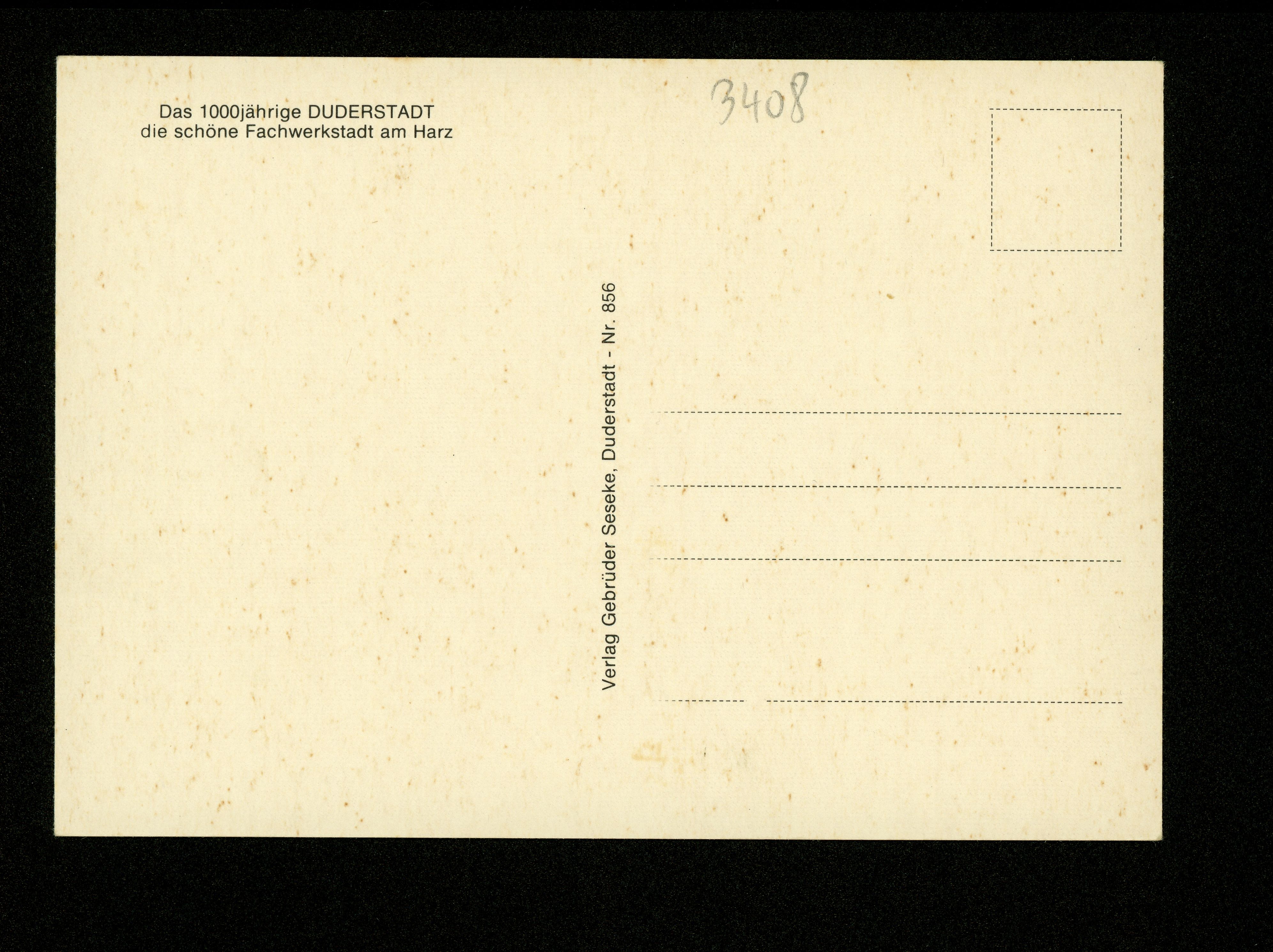 Ort Duderstadt Beschreibung Variante "Rückseite" Motive Rathaus Marktstraße m. St. Servatius Fachwerkhäuser i.d. Hinterstr. Format groß Verlag Gebrüder Seseke, Duderstadt Bestell- oder Individualnummer Nr. 856 Tags Anreischke Hinterstraße