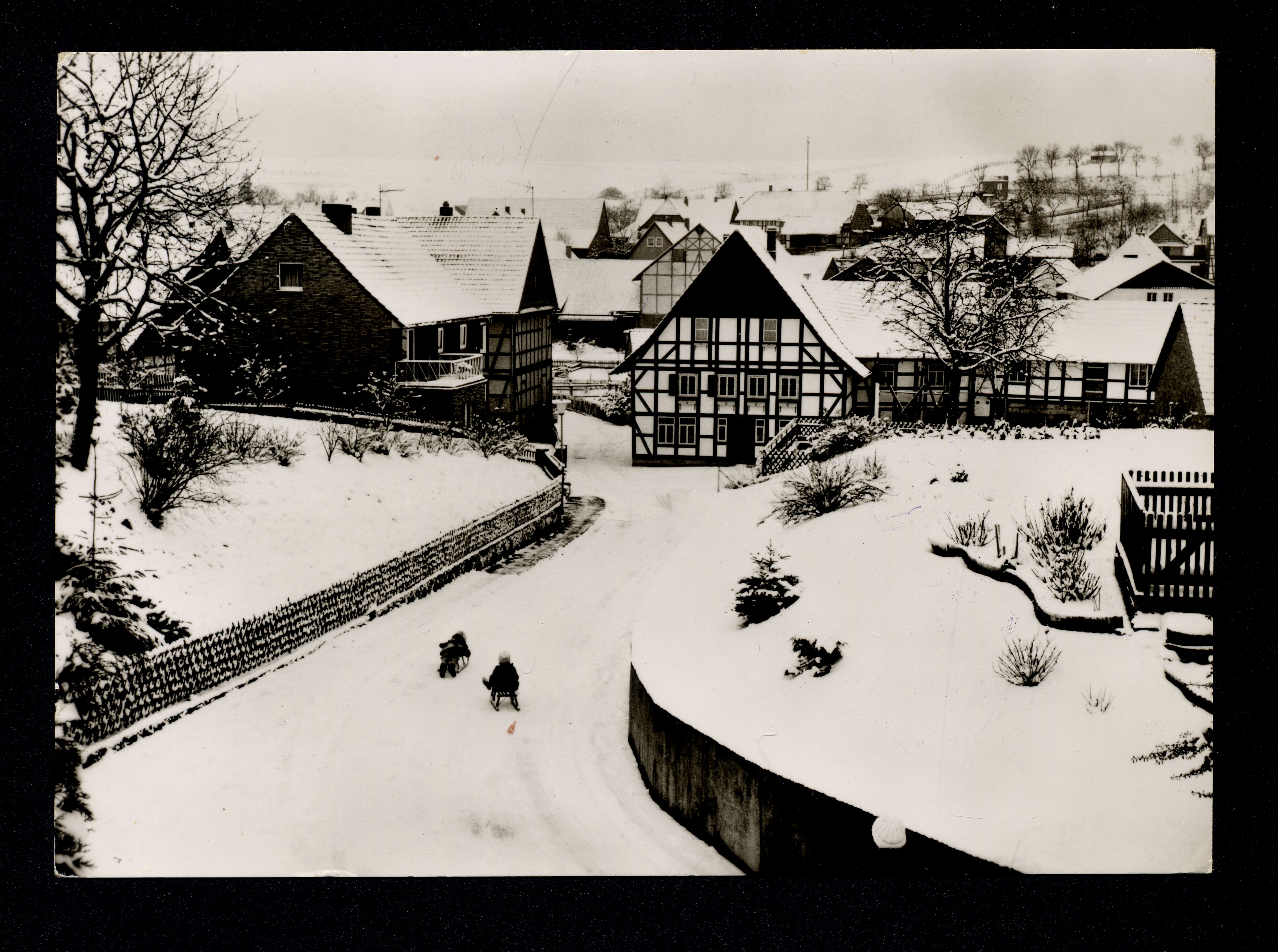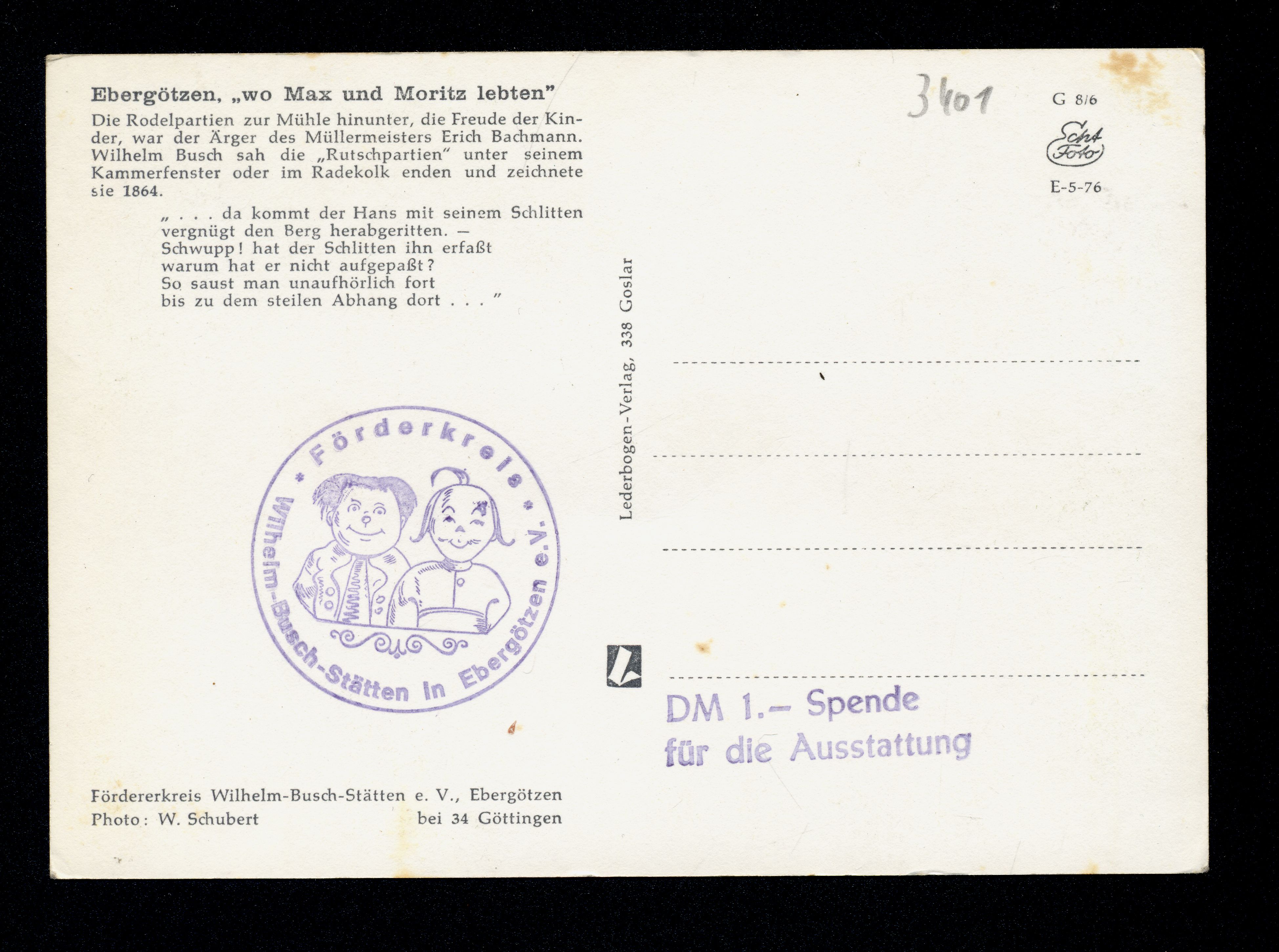 Ort Ebergötzen Motive Die Rodelpartie zur Mühle hinunter Format groß Verlag Lederbogen-Verlag, Goslar Bestell- oder Individualnummer G 8/6 E-5-76