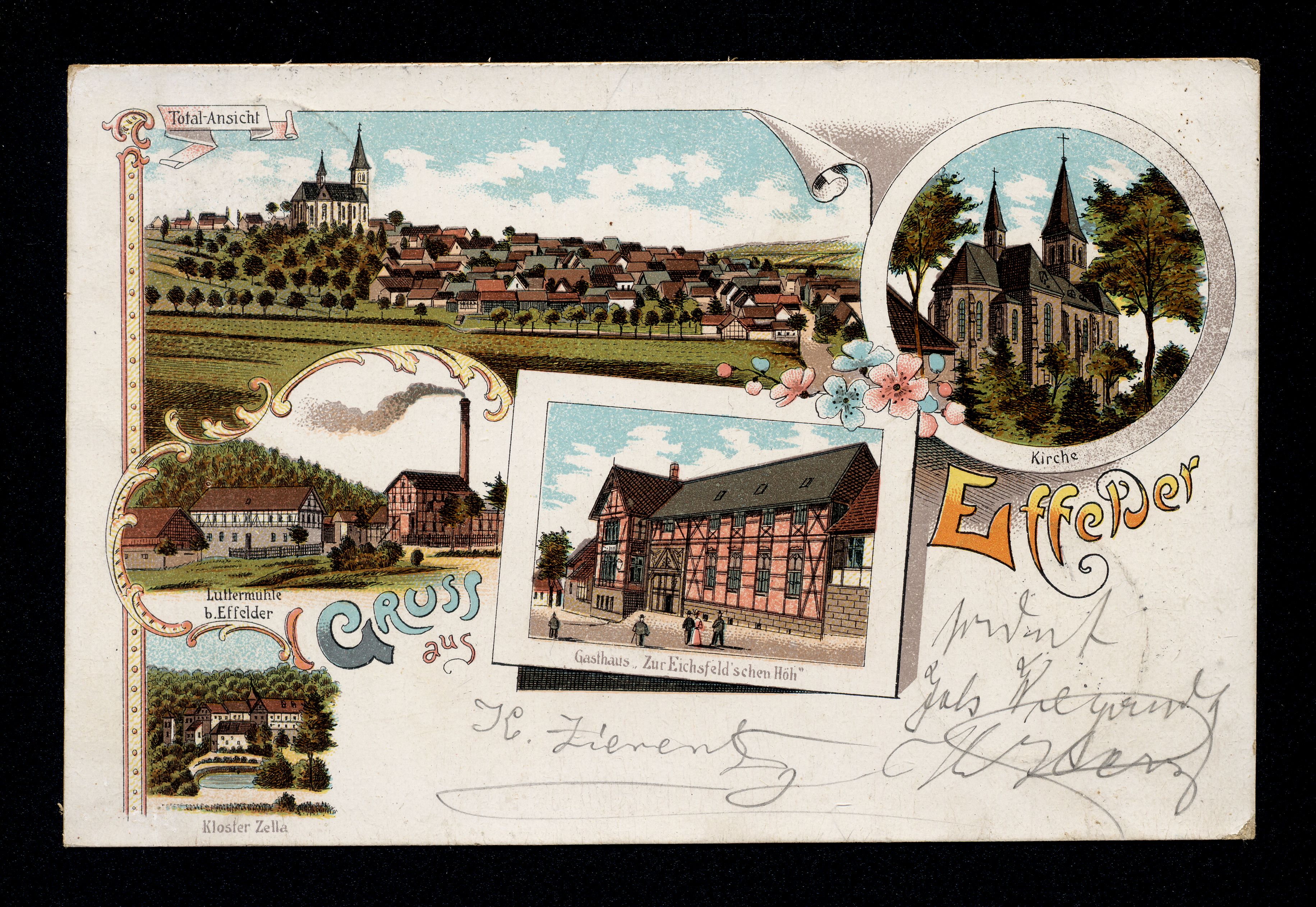 Ort Effelder Motive Total-Ansicht Luttermühle b. Effelder Kloster Zella Gasthaus ''Zur Eichsfeld'schen Höh'' Kirche Format klein Jahr 1899 Verlag - Bestell- oder Individualnummer - Versanddatum 13.06.1899 Tags Rodeberg
