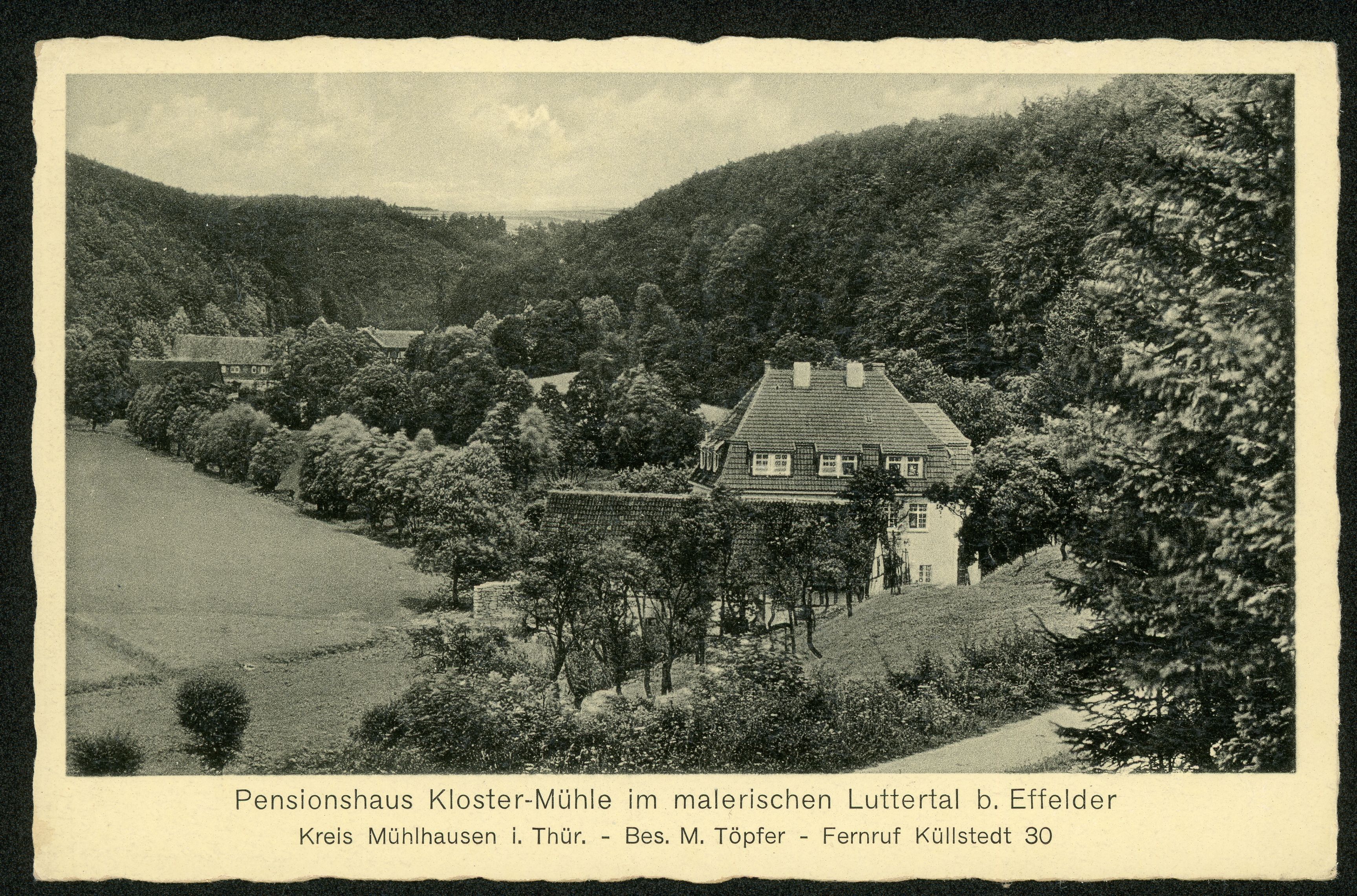 Ort Effelder Beschreibung Sammlung: H.M.D. Motive Pensionshaus Kloster-Mühle im malerischen Luttertal b. Effelder Kreis Mühlhausen i. Thür. - Bes. M. Töpfer Format klein Verlag Aloys Mecke, Duderstadt Bestell- oder Individualnummer Nr. 719 b 80 Tags Klostermühle Gasthaus