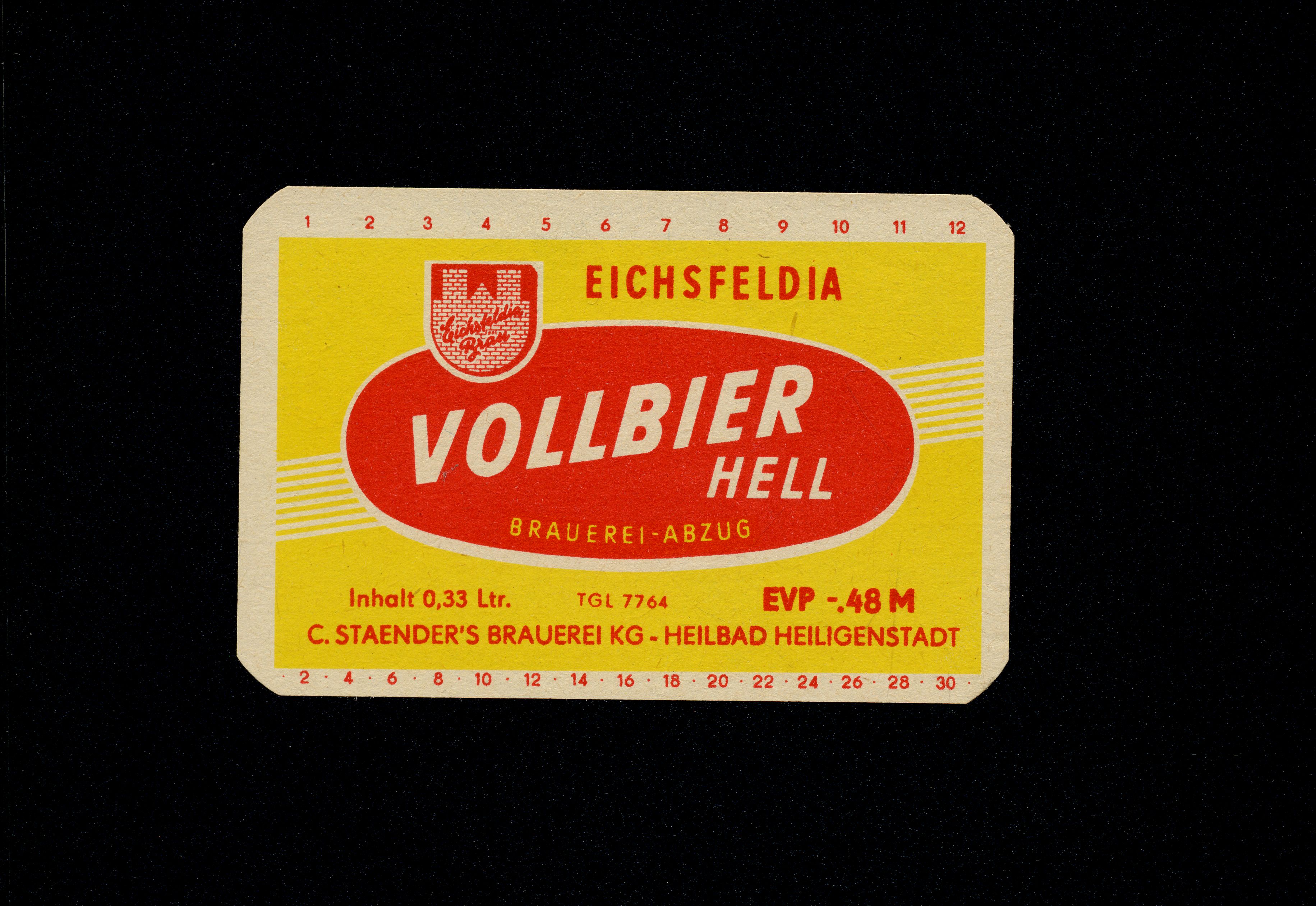 Ort Heiligenstadt - Belege Beschreibung Flaschenetikett Motive Eichsfeldia Vollbier Hell C. Staender's Brauerei Format Sonderformat Verlag - Bestell- oder Individualnummer TGL 7764