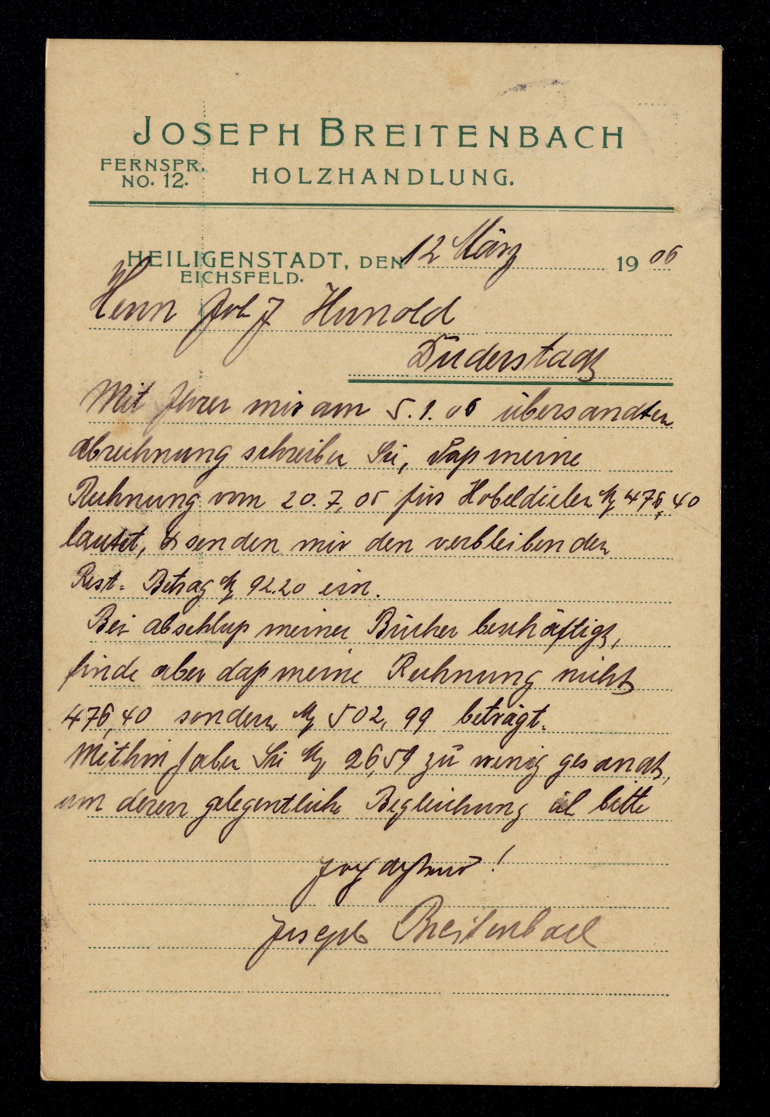 Ort Heiligenstadt Motive Joseph Breitenbach, Holzhandlung Format klein Jahr 1906 Verlag - Bestell- oder Individualnummer - Versanddatum 12.03.1906