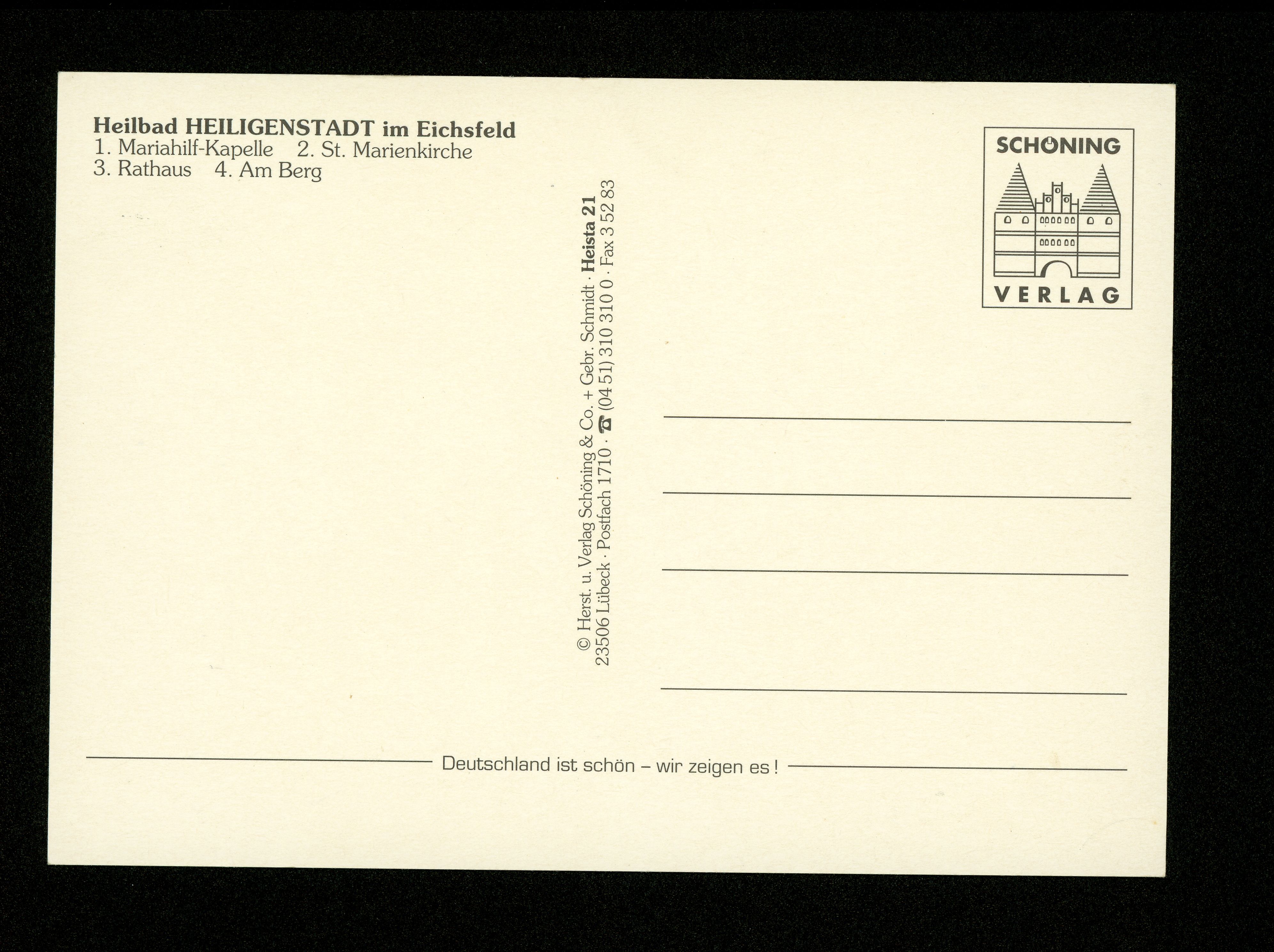Ort Heiligenstadt Motive Mariahilf-Kapelle St. Marienkirche Rathaus Am Berg Format groß Verlag Chr. Schöning & Co., Lübeck (+ Gebrüder Schmidt) Bestell- oder Individualnummer Heista 21