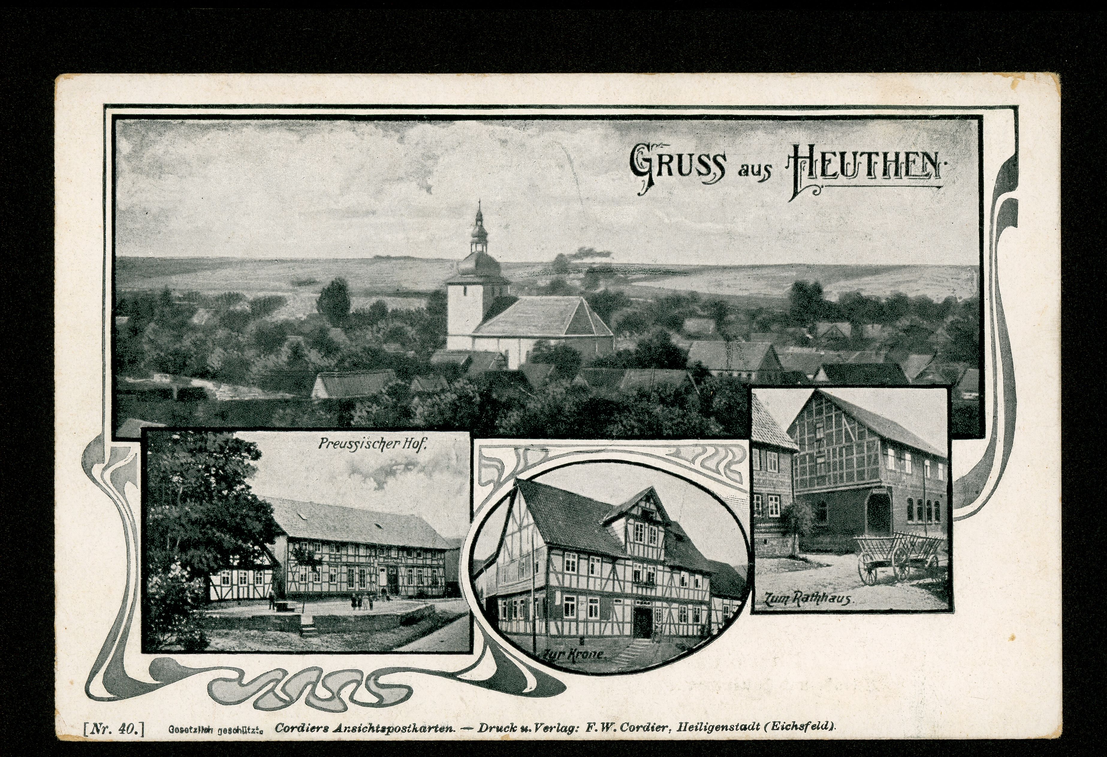 Ort Heuthen Motive Kirche Preussischer Hof Zur Krone Zum Rathhaus Format klein Verlag F. W. Cordier, Heiligenstadt Bestell- oder Individualnummer Nr. 40 Tags Gasthaus Leiterwagen