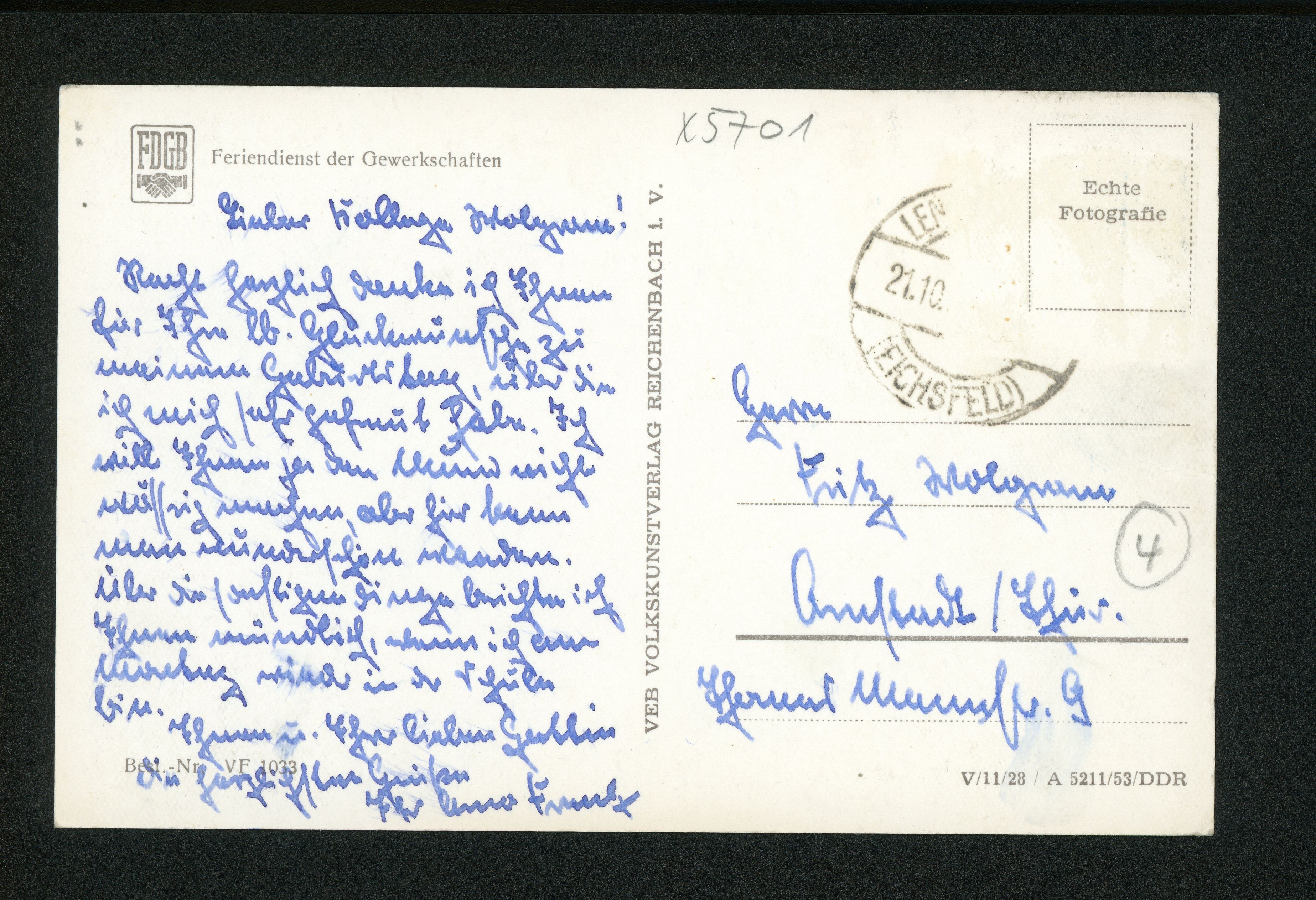 Ort Lengenfeld unterm Stein Motive FDGB-Ferienheim ''Bischofstein'' Format klein Jahr 1953 Verlag Volkskunstverlag, Reichenbach i. V. Bestell- oder Individualnummer Best.-Nr. VF 1033 V/11/28 / A 5211/53