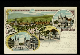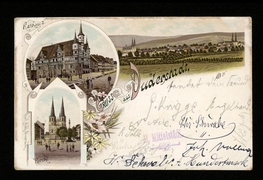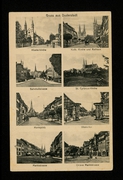 Bahnhofstraße m. evang. Kirche, Obere Marktstr. m. kath. Kirche, Marktstraße, Bahnhofstraße, Westerthurm, Marktplatz, Spiegelbrücke mit Westerthurm, Marktplatz mit Mariensäule, Königl. Progymnasium, Nordseite, Panorama, Rathaus |