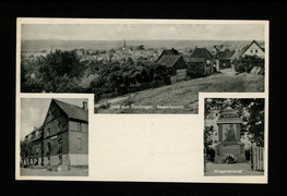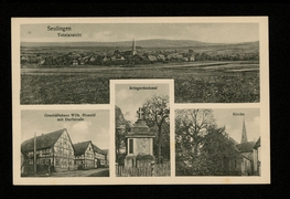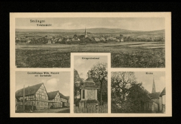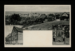 Totalansicht, Kriegerdenkmal, Geschäftshaus Wilh. Hunold mit Dorfstraße, Kirche |