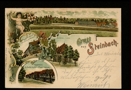 Totalansicht von Steinbach, Wallfahrtsort Ezelsbach, Gast u. Schenk-Wirtschaft v. Wwe Heinrich Reimann, Hauptstrasse m. Gastwirthschaft v. Franz Hartung |