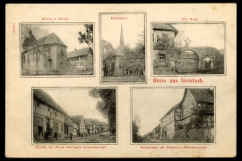 Kirche u. Schule, Etzelsbach, Alte Burg, Strasse mit Franz Hartung's Gastwirtschaft, Bergstrasse mit Reimann's Gastwirtschaft |