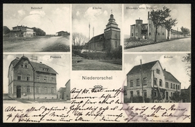 Bahnhof, Postamt, Kirche, Schule, Riemann'sche Weberei |