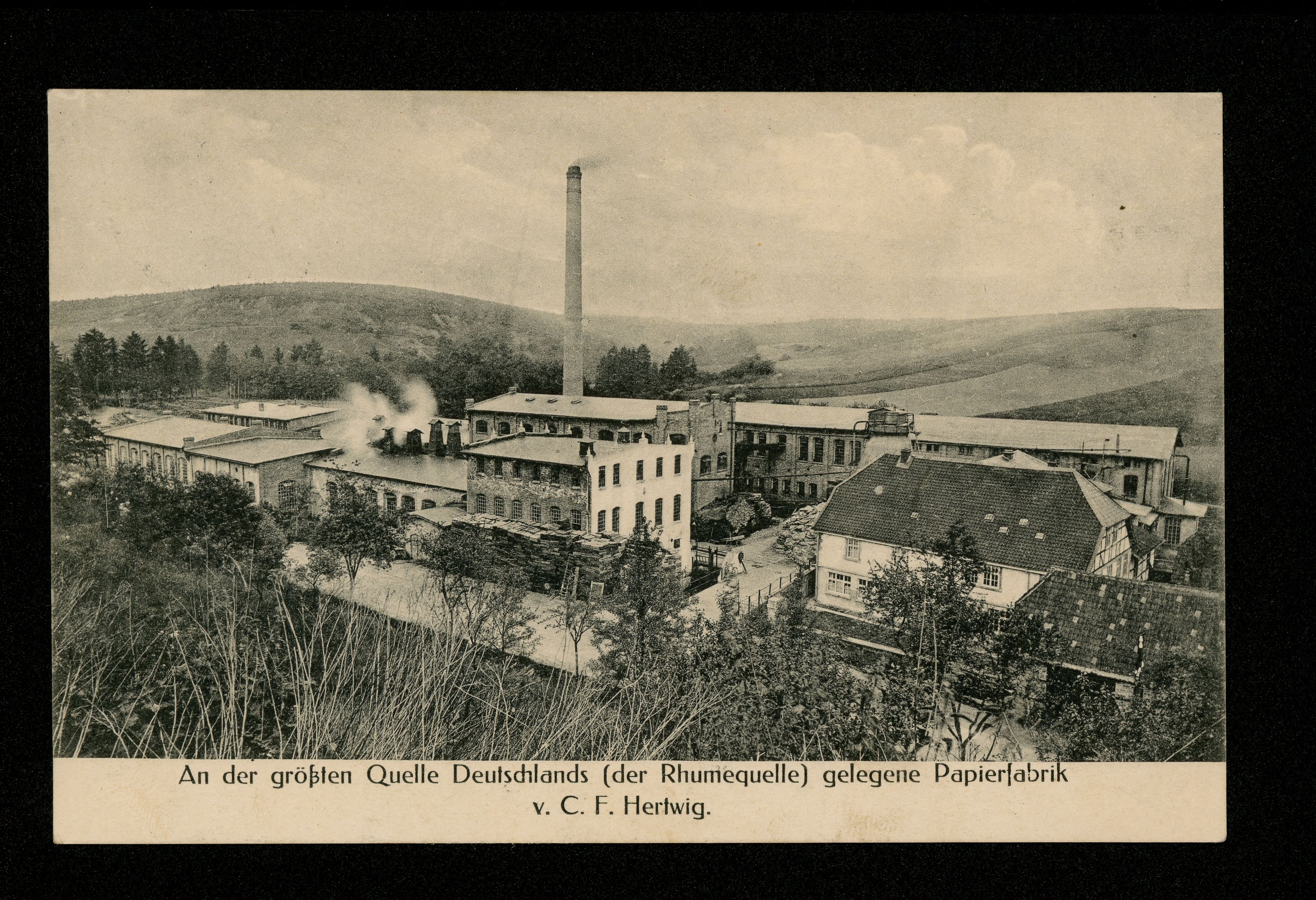 Ort Rhumspringe Motive An der größten Quelle Deutschlands ''der Rhumequelle'' gelegene Papierfabrik von C. F. Hertwig Format klein Jahr 1914 Verlag Aug. Alten, Hannover Bestell- oder Individualnummer - Tags Harzer Papierfabrik GmbH