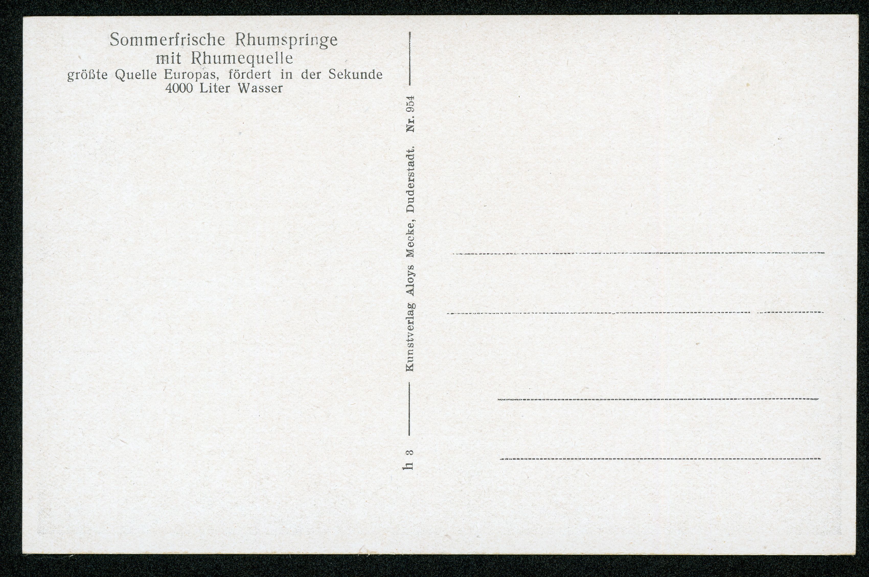 Ort Rhumspringe Beschreibung Sammlung: H.M.D. Motive Eisenbanbrücke über die Rhume mit Blick auf Rhumspringe Format klein Verlag Aloys Mecke, Duderstadt Bestell- oder Individualnummer Nr. 954 h 3 Tags Eisenbahnviadukt