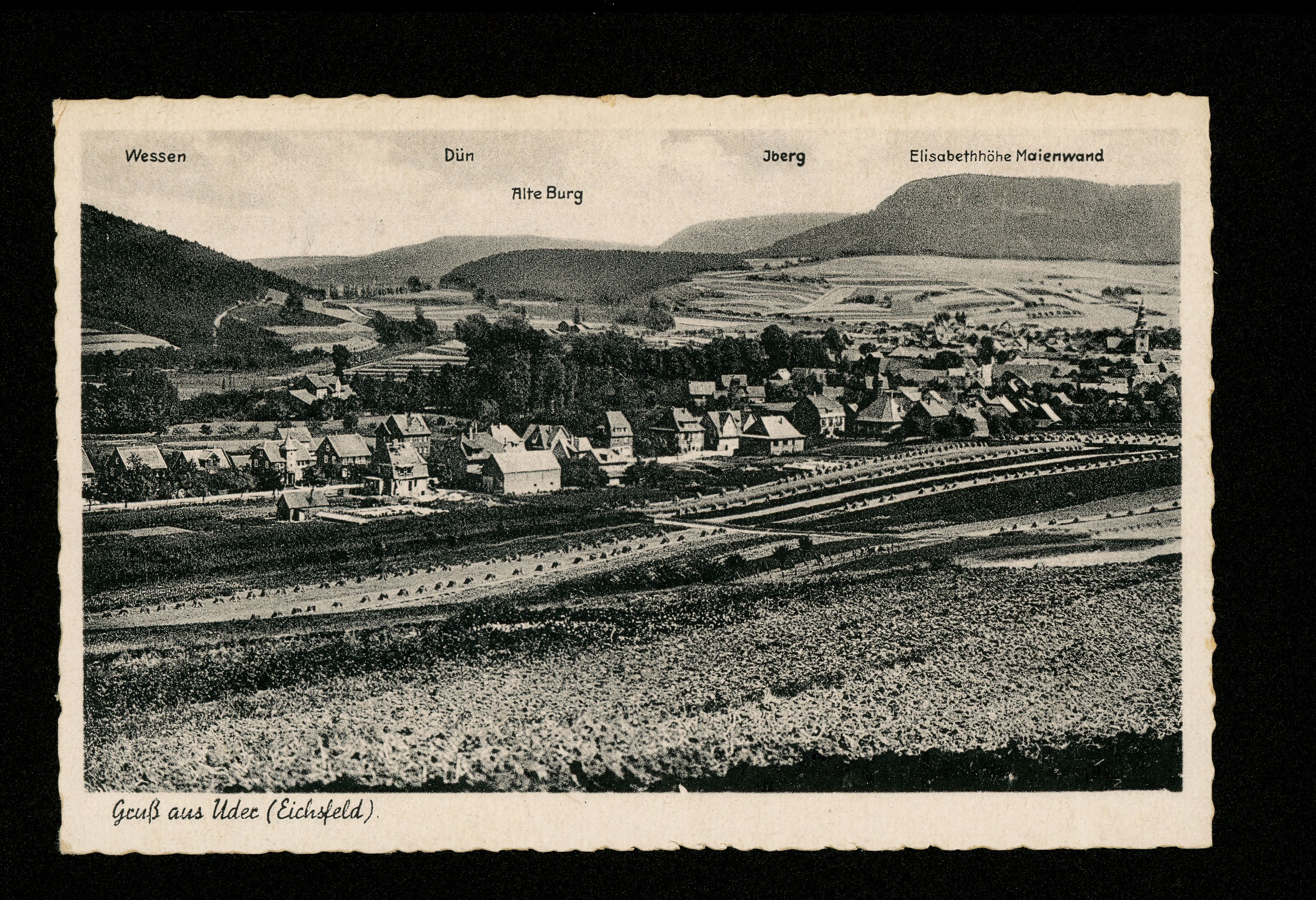Ort Uder Motive Panorama Format klein Jahr 1944 Verlag Carl Thoericht, Hann.-Münden (Karl Thoericht) (CTM) Bestell- oder Individualnummer Nr. 15427a Nr. E 01247/44 144 Li. 23 Tags Wessen Dün Alte Burg Iberg Elisabethhöhe Maienwand
