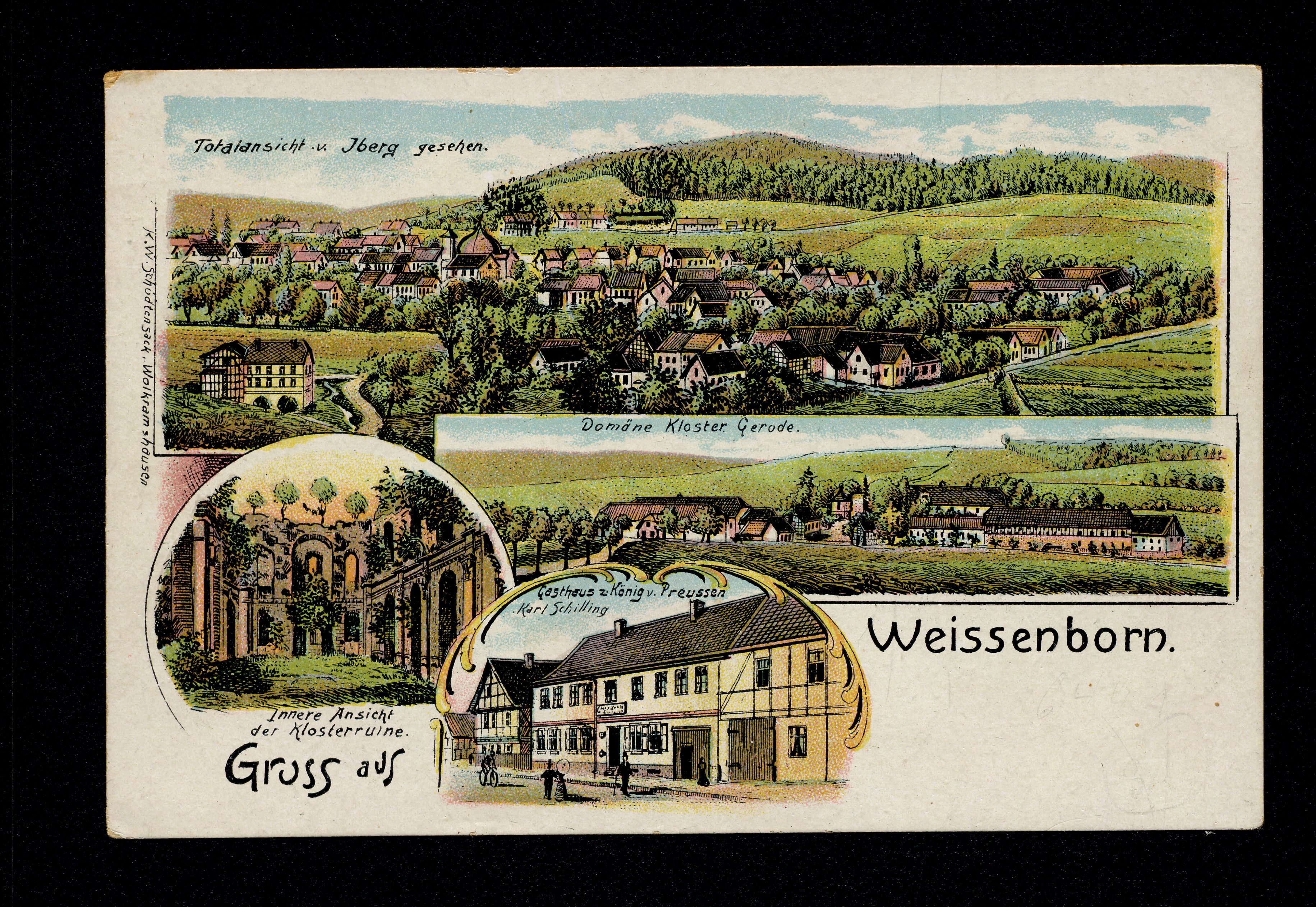 Ort Weißenborn-Lüderode Beschreibung Variante "Rückseite" und "Kolorierung" Motive Totalansicht v. Iberg gesehen Innere Ansicht der Klosterruine Domäne Kloster Gerode Gasthaus z. König v. Preussen v. Karl Schilling Format klein Verlag K. W. Schödtensack, Wolkramshausen Bestell- oder Individualnummer - Tags Gasthaus zum König von Preussen
