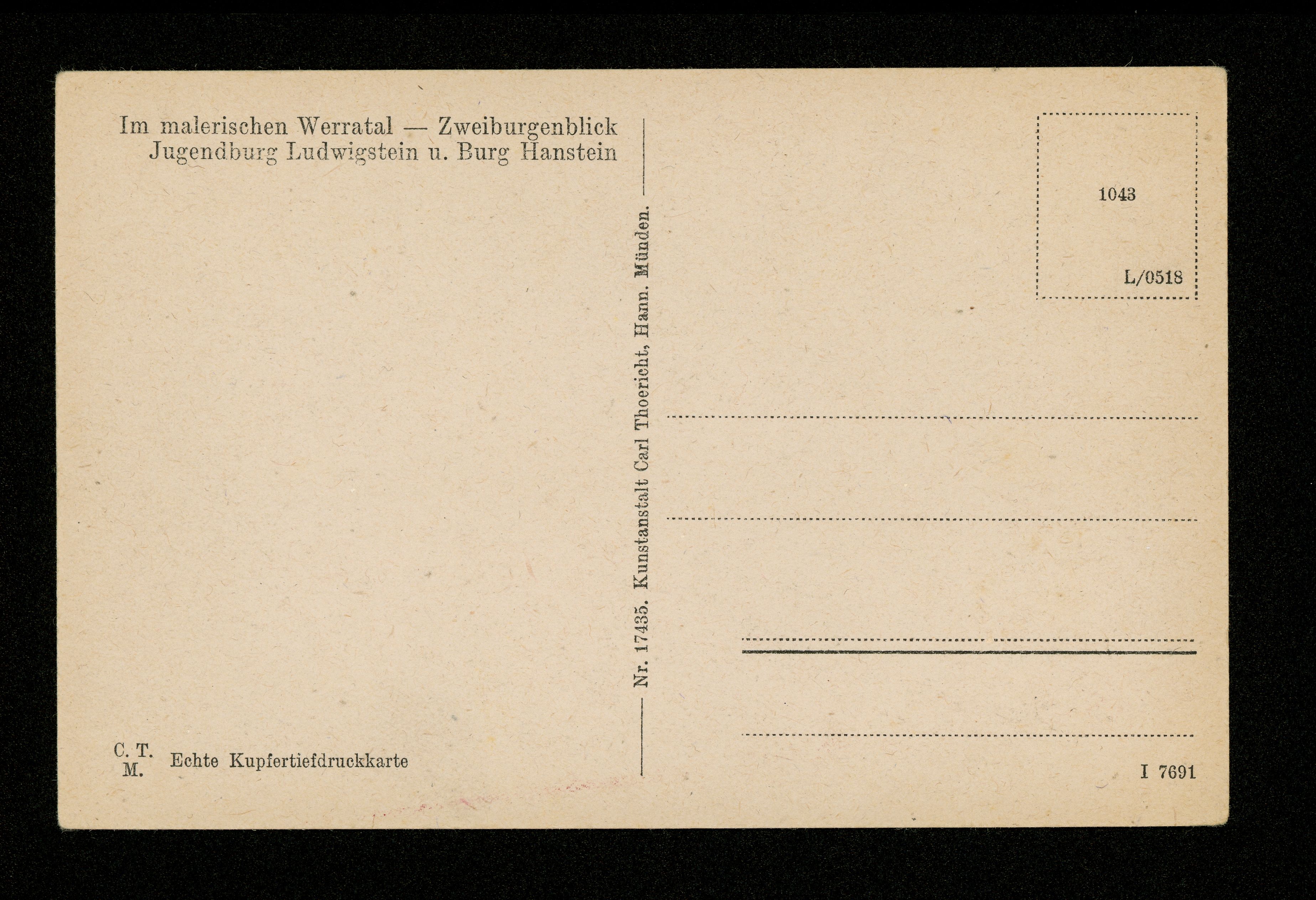 Ort Werleshausen Motive Jugendburg Ludwigstein u. Burg Hanstein Format klein Verlag Carl Thoericht, Hann.-Münden (Karl Thoericht) (CTM) Bestell- oder Individualnummer Nr. 17435 I 7691 1043 L/0518 Tags Burg Ludwigstein