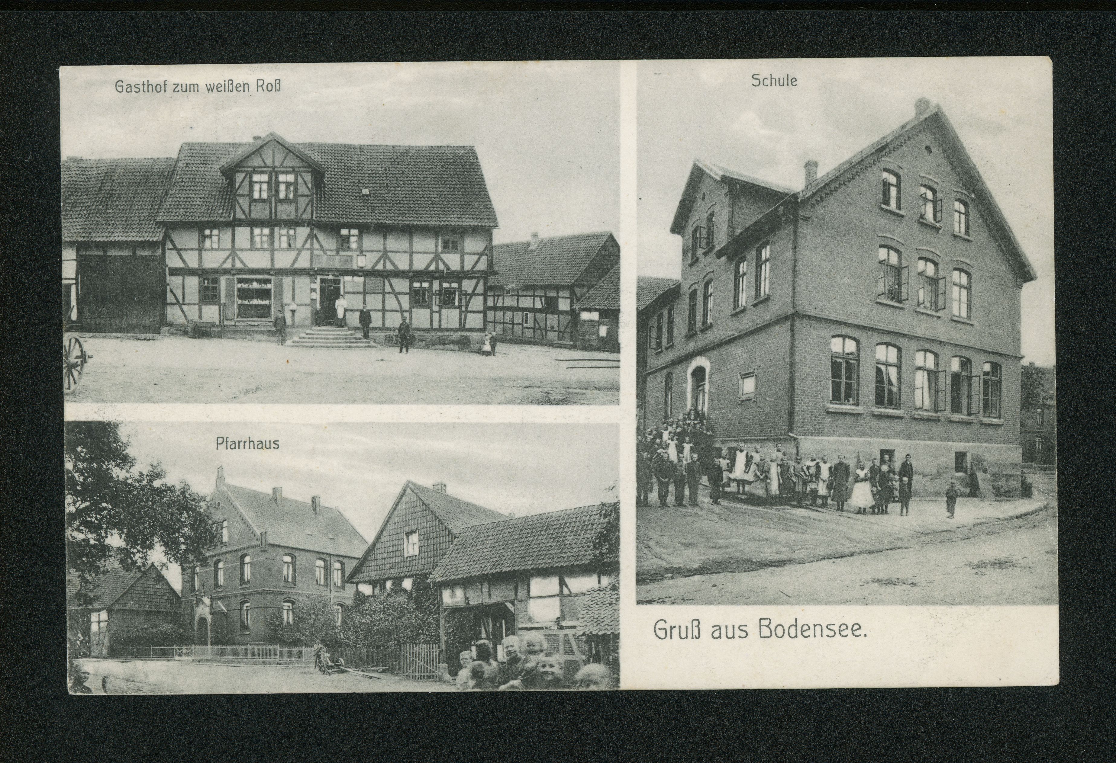Ort Bodensee Motive Gasthof zum weißen Roß Pfarrhaus Schule Format klein Jahr 1910 Verlag Rolf & Co., Hannover Bestell- oder Individualnummer 20032 Tags Gasthaus