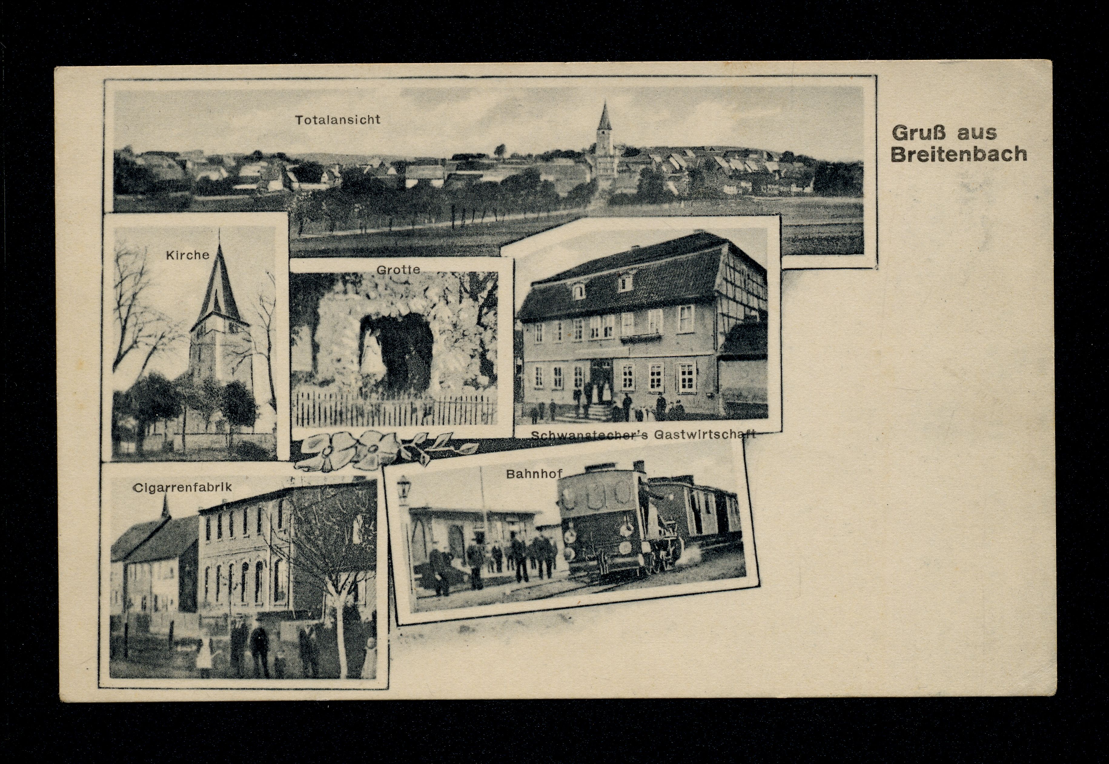 Ort Breitenbach Motive Totalansicht Kirche Grotte Cigarrenfabrik Bahnhof Schwanstecher's Gastwirtschaft Format klein Verlag - Bestell- oder Individualnummer L 91 Tags Gasthaus Eisenbahn Zigarrenfabrik