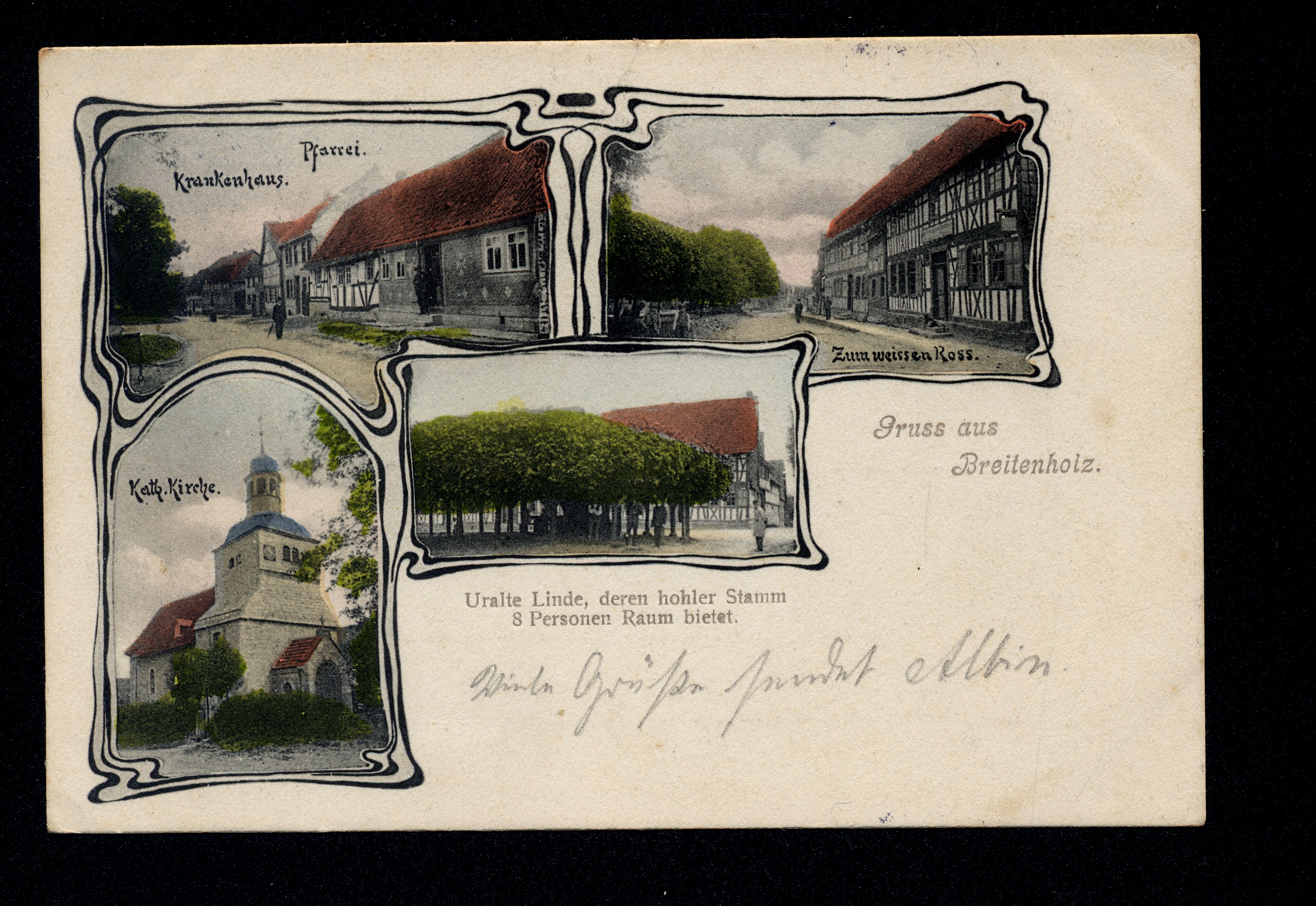 Ort Breitenholz Motive Krankenhaus Pfarrei Zum weissen Ross Kath. Kirche Uralte Linde Format klein Jahr 1906 Verlag - Bestell- oder Individualnummer - Versanddatum 17.09.1906 Tags Gasthaus