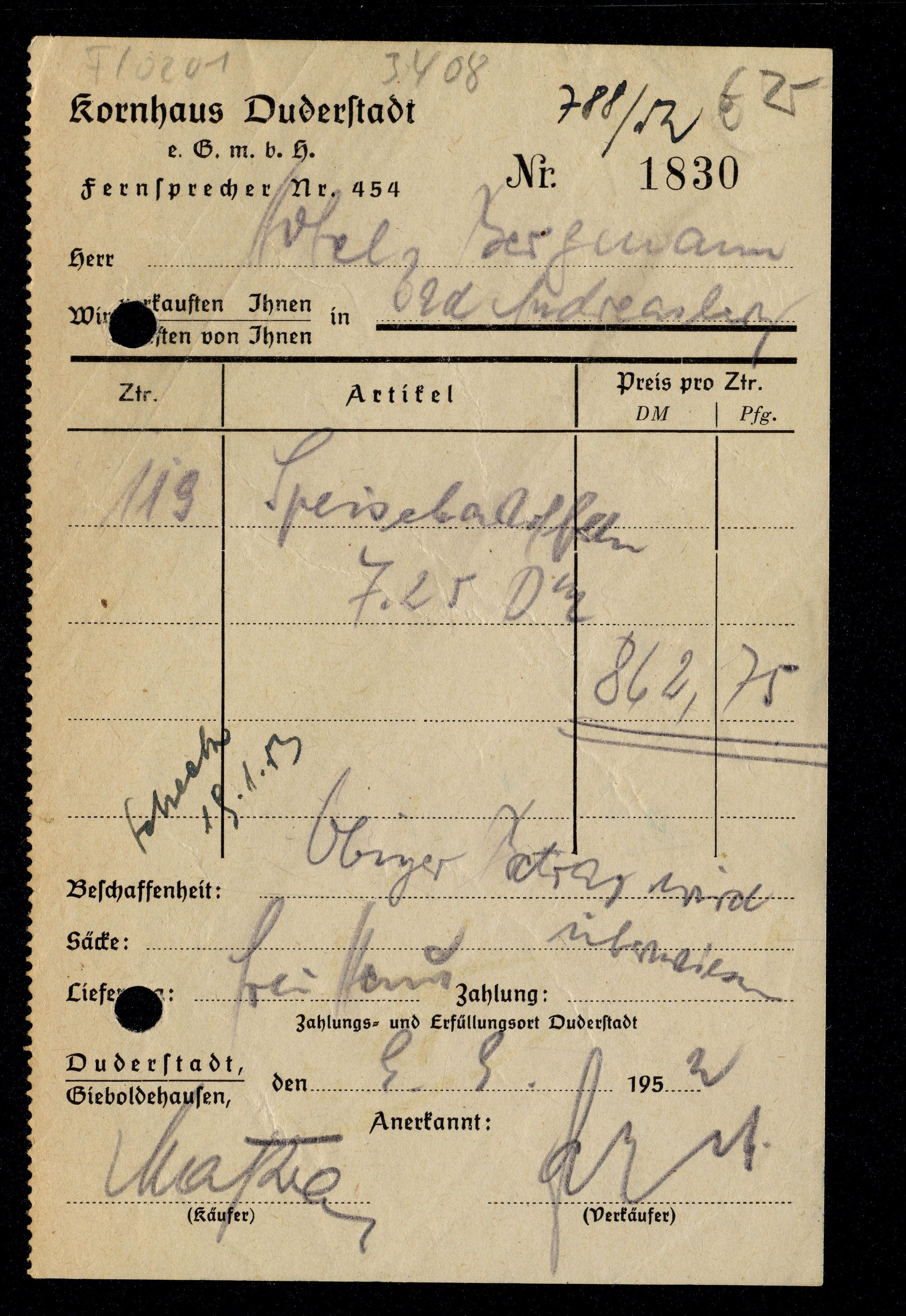 Ort Duderstadt - Belege Beschreibung Beleg auf Papier Motive Kornhaus Duderstadt e.G.m.b.H. Format Sonderformat Jahr 1952 Verlag - Bestell- oder Individualnummer - Tags Speisekartoffeln