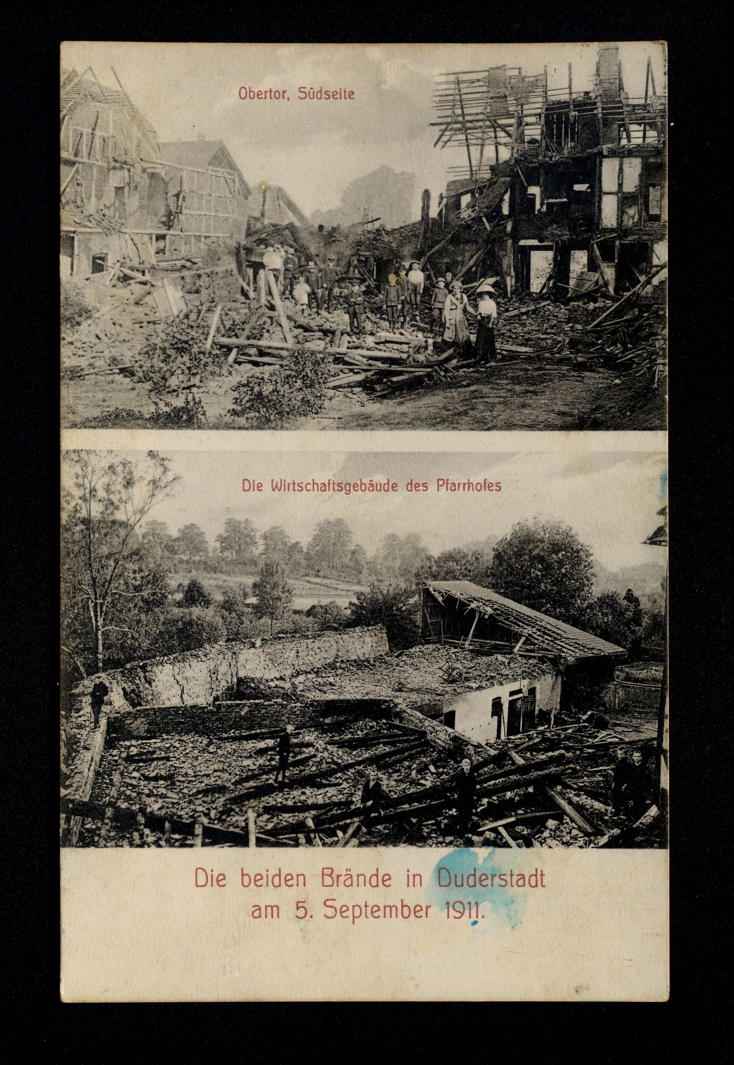 Ort Duderstadt Motive Obertor, Südseite Die Wirtschaftsgebäude des Pfarrhofes Format klein Jahr 1911 Verlag H. Richwien, Duderstadt Bestell- oder Individualnummer 11832 Tags Obertor Pfarrhof Katastrophe