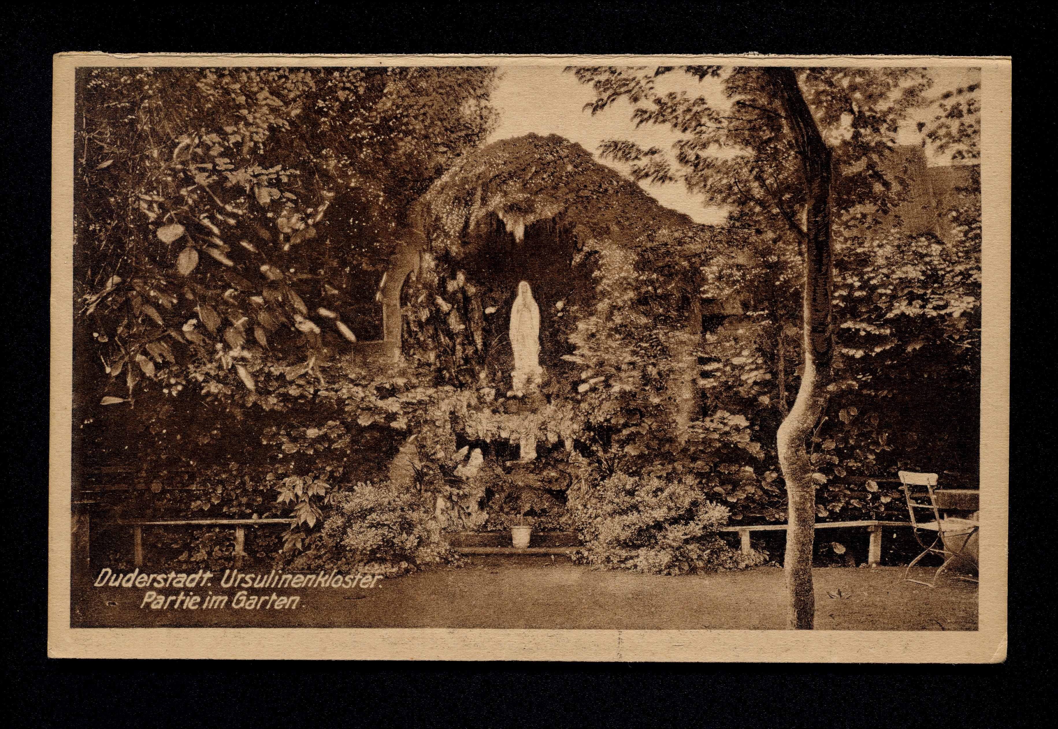Ort Duderstadt Motive Ursulinenkloster. Partie im Garten Format klein Verlag Aloys Mecke, Duderstadt Bestell- oder Individualnummer s 53632 Tags Ursulinenkloster Madonna
