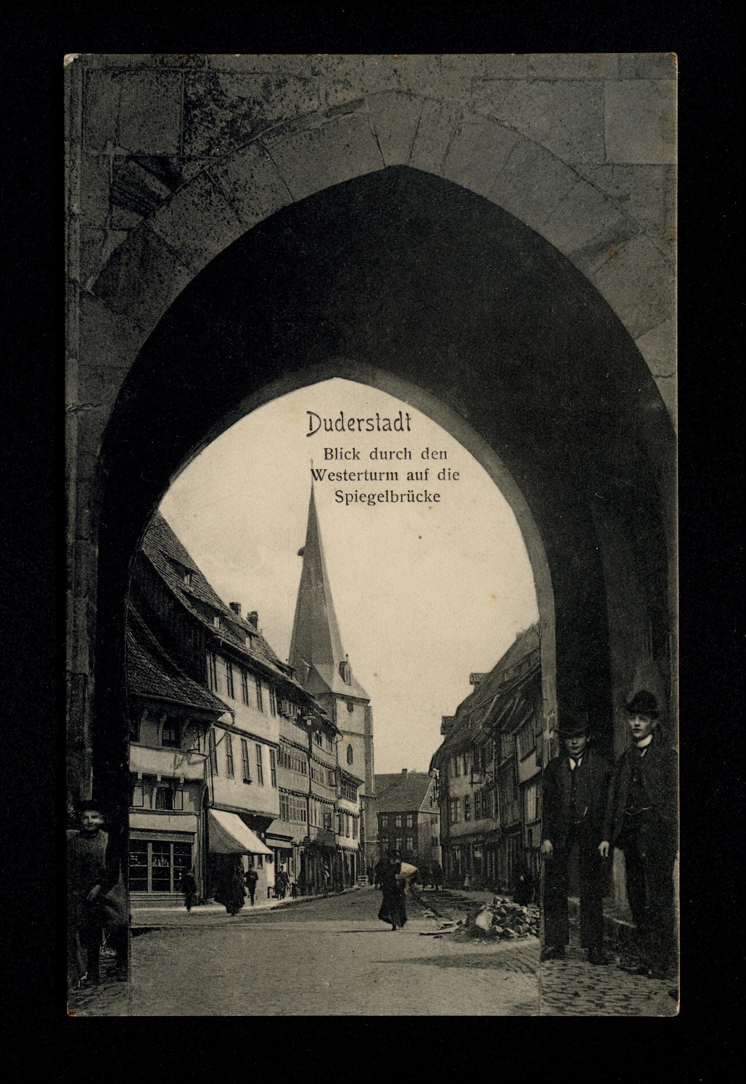Ort Duderstadt Motive Blick durch den Westerturm auf die Spiegelbrücke Format klein Verlag Aloys Mecke, Duderstadt Bestell- oder Individualnummer No. 1664 Tags St. Servatius-Kirche