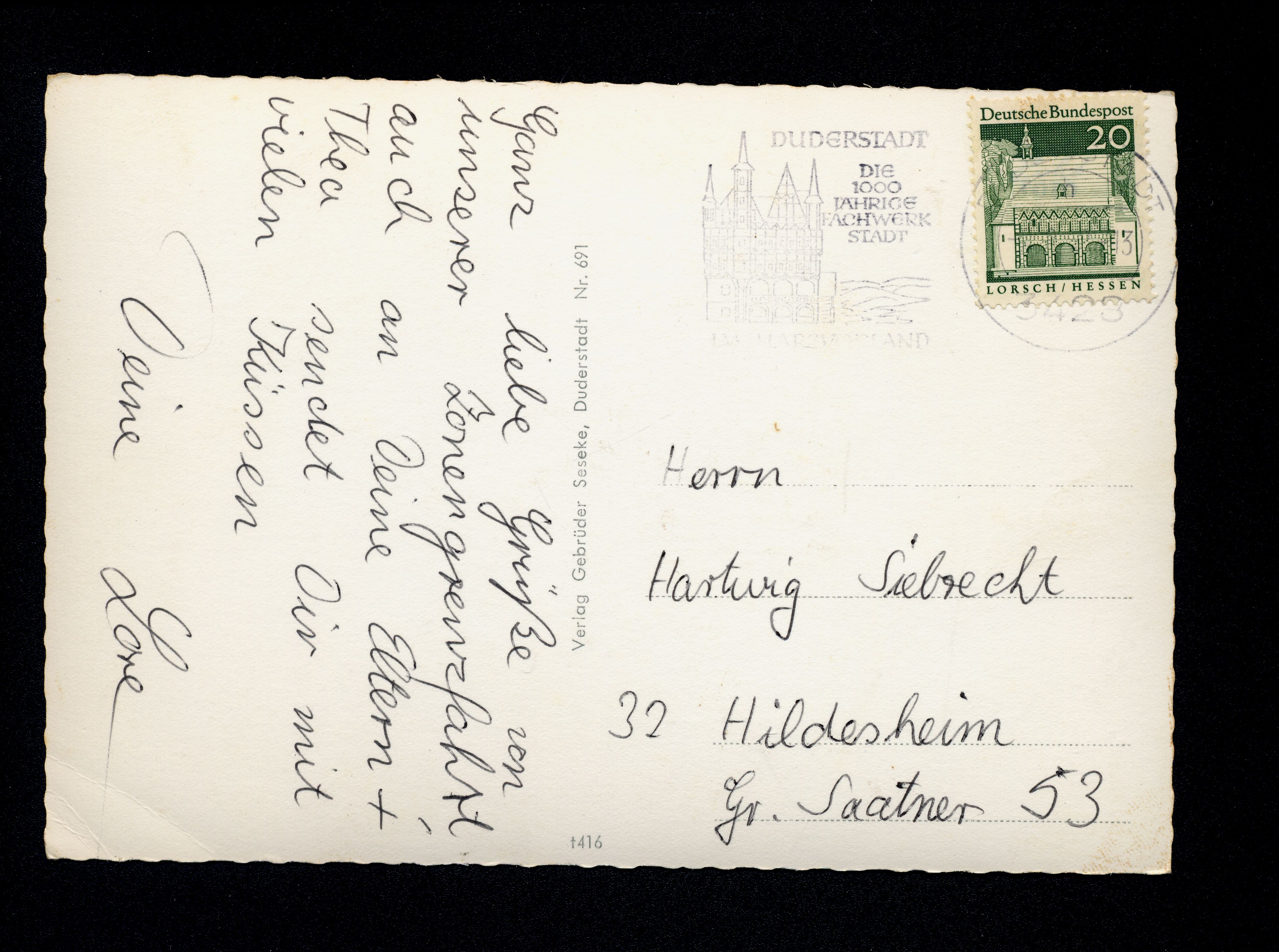 Ort Duderstadt Motive St. Cyriakus mit Mariensäule Gesamtansicht Rathaus Westerturm Ehrenmal mit Hollenbachstiftung Anreischken Hotel zur Tanne Format groß Verlag Gebrüder Seseke, Duderstadt Bestell- oder Individualnummer Nr. 691 t416