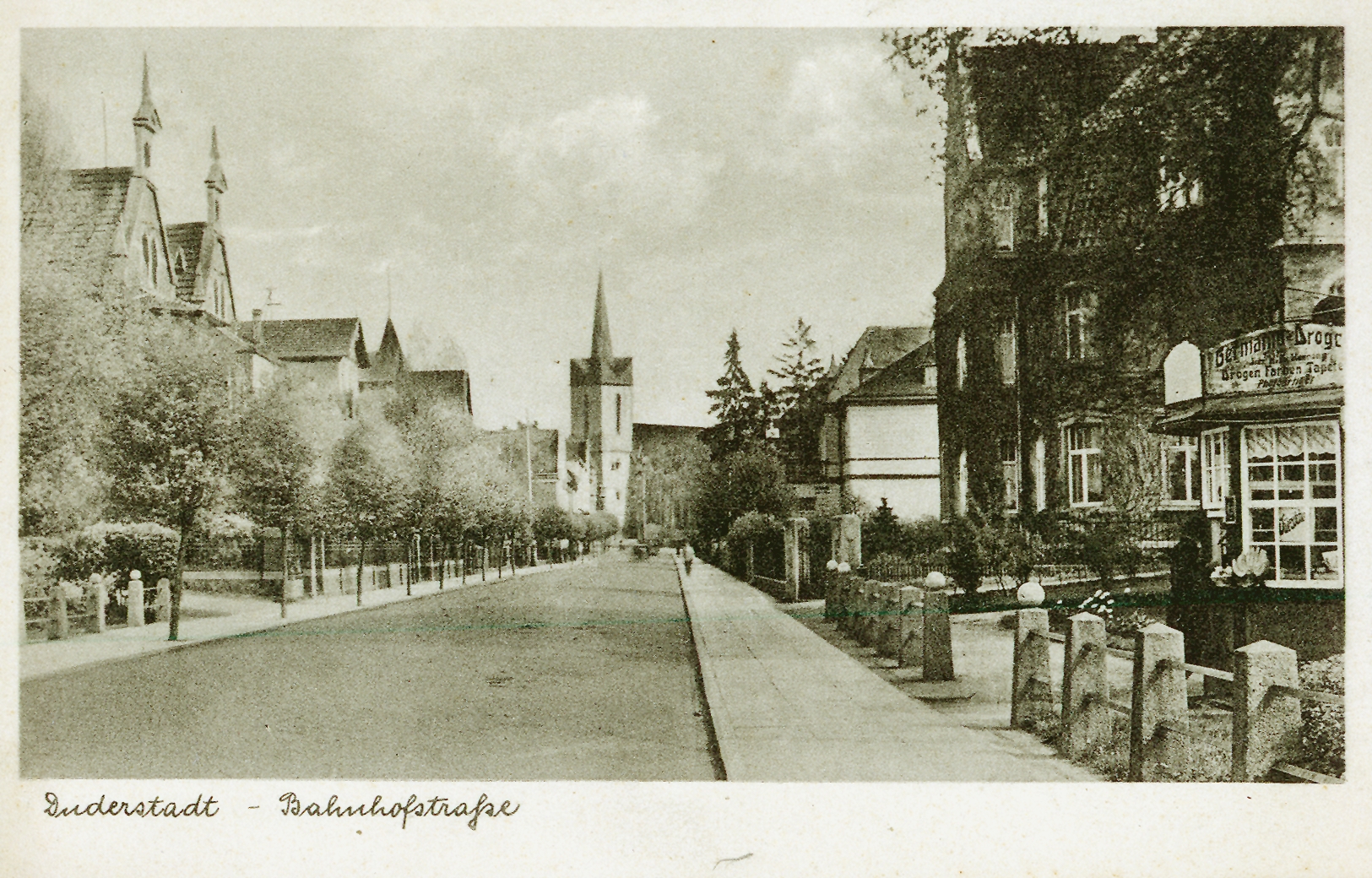 Ort Duderstadt Beschreibung Sammlung: H.M.D. Motive Bahnhofstraße Format klein Verlag - Bestell- oder Individualnummer - Tags St. Servatius-Kirche Germania Drogerie