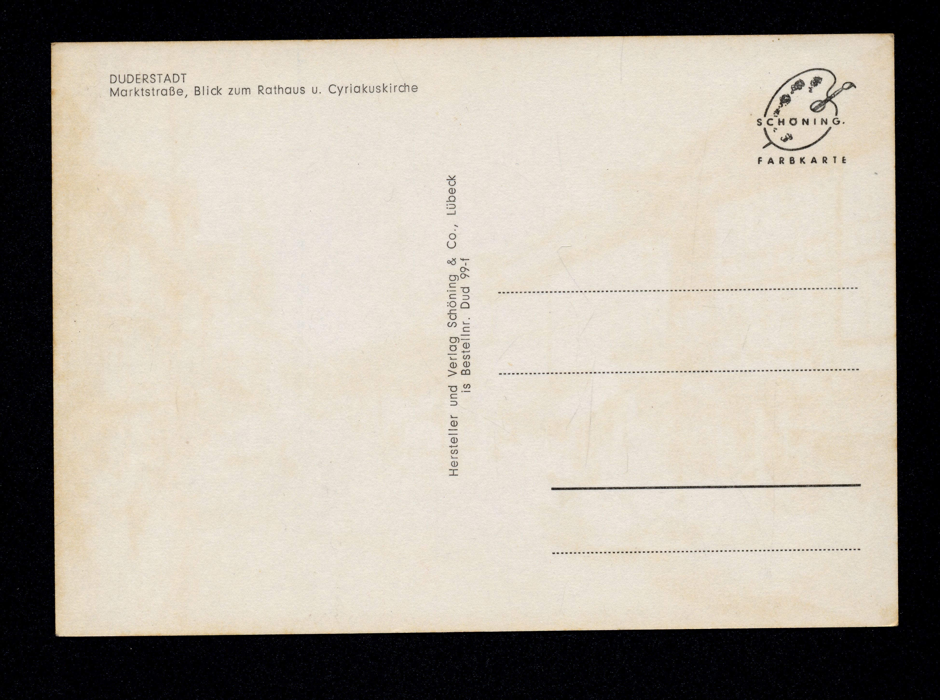 Ort Duderstadt Motive Marktstraße Blick zum Rathaus u. Cyriakuskirche Format groß Verlag Chr. Schöning & Co., Lübeck (+ Gebrüder Schmidt) Bestell- oder Individualnummer is Bestellnr. Dud 99-f Tags Gustav Kortekamp