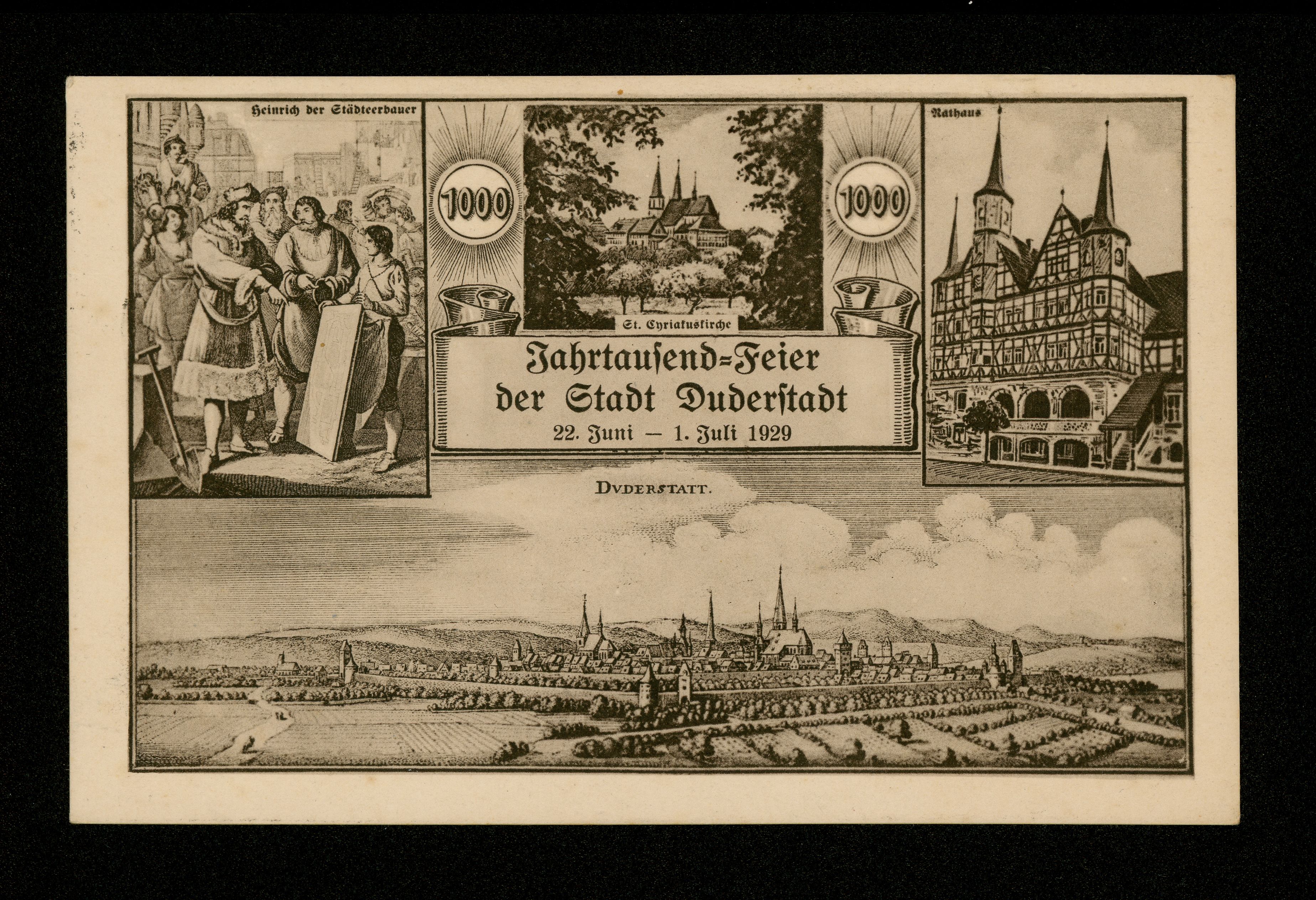 Ort Duderstadt Motive Heinrich der Städteerbauer St. Cyriakuskirche Rathaus Panorama Format klein Jahr 1929 Verlag - Bestell- oder Individualnummer - Versanddatum 24.06.1929 Tags Kaiser Heinrich I. der Vogler ''Ostfrankenreich''