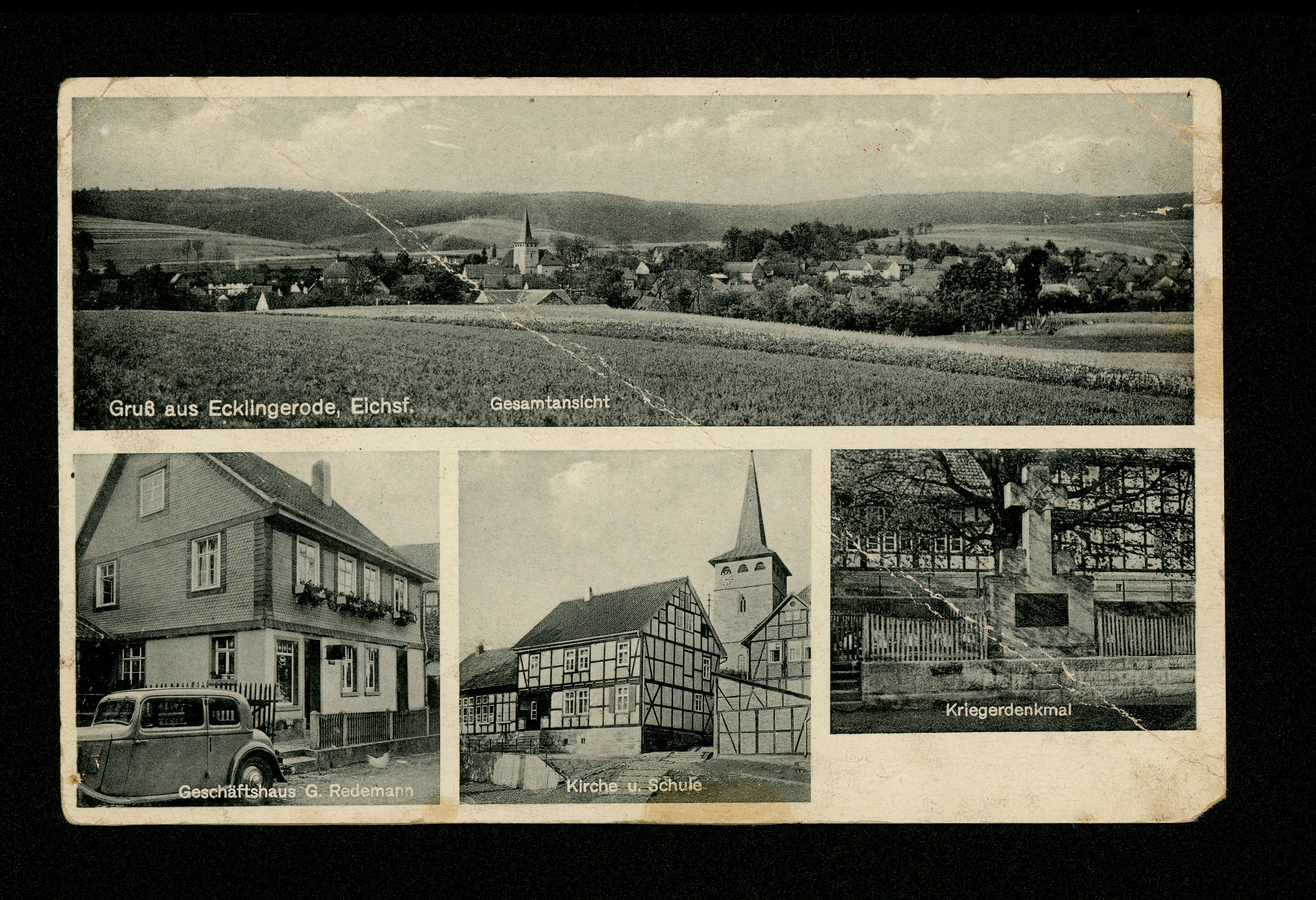 Ort Ecklingerode Motive Gesamtansicht Geschäftshaus G. Redemann Kirche u. Schule Kriegerdenkmal Format klein Verlag (unleserlich) Bestell- oder Individualnummer ''unleserlich'' Z 71 Tags Feldpost