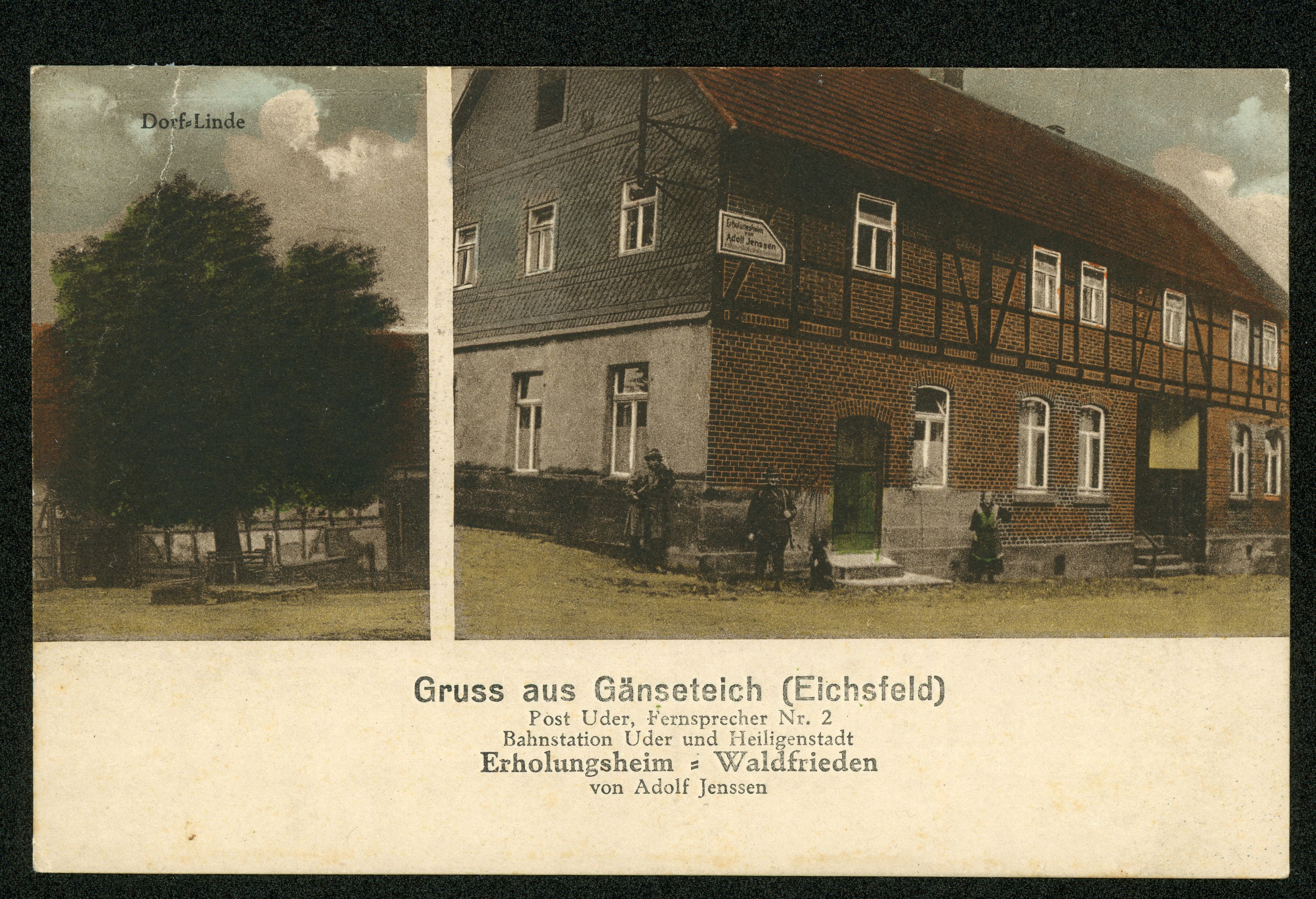 Ort Gänseteich Beschreibung Sammlung: H.M.D. Motive Dorf=Linde Erholungsheim = Waldfrieden von Adolf Jenssen Format klein Verlag Köhler, Uder Bestell- oder Individualnummer 253 Tags Gasthaus