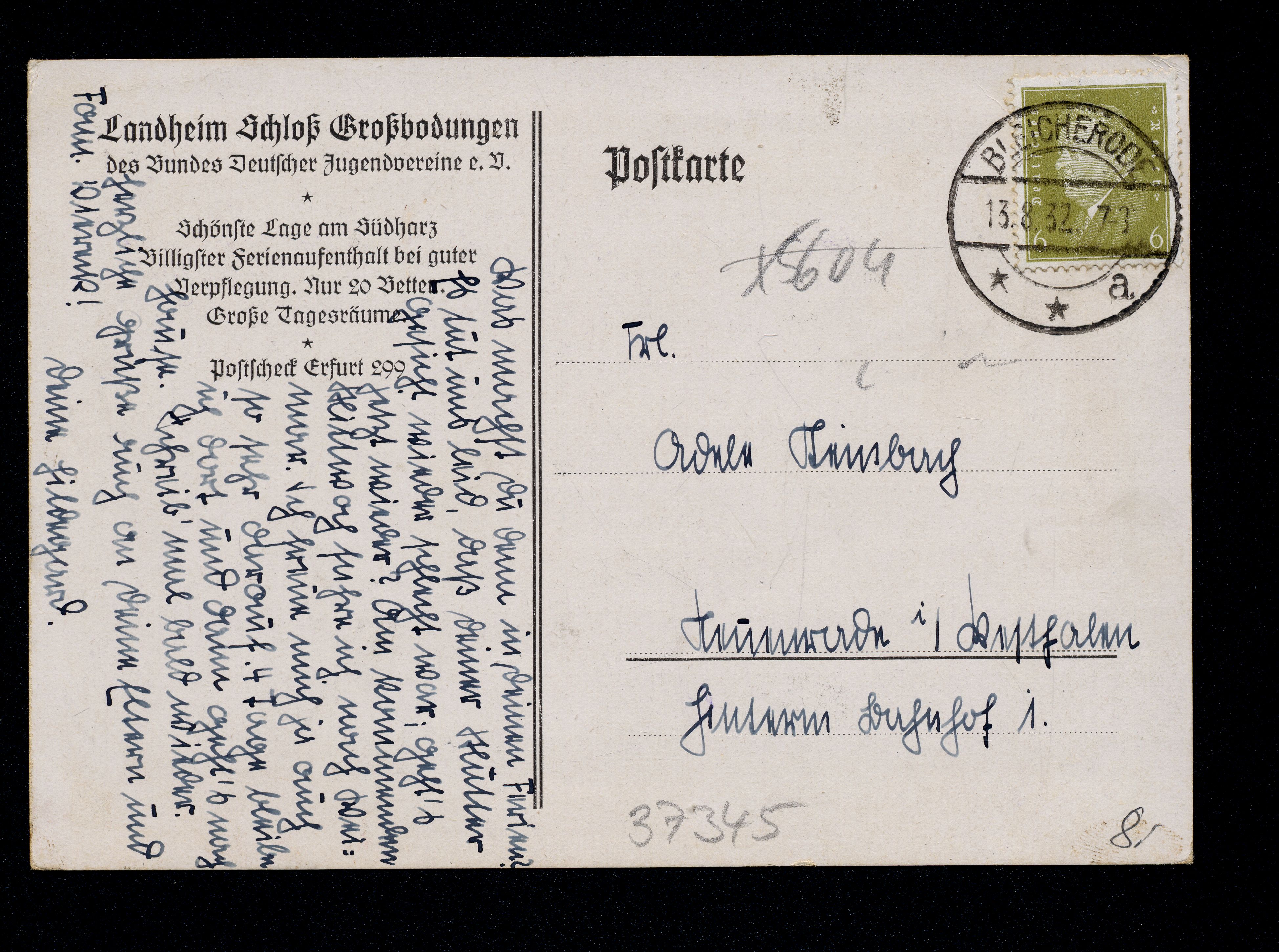 Ort Großbodungen Motive Landheim Schloß Großbodungen des Bundes Deutscher Jugendvereine e.V. Format groß Jahr 1932 Verlag - Bestell- oder Individualnummer - Versanddatum 13.08.1932 Tags Bund deutscher Jugendvereine BDJ Burg Großbodungen