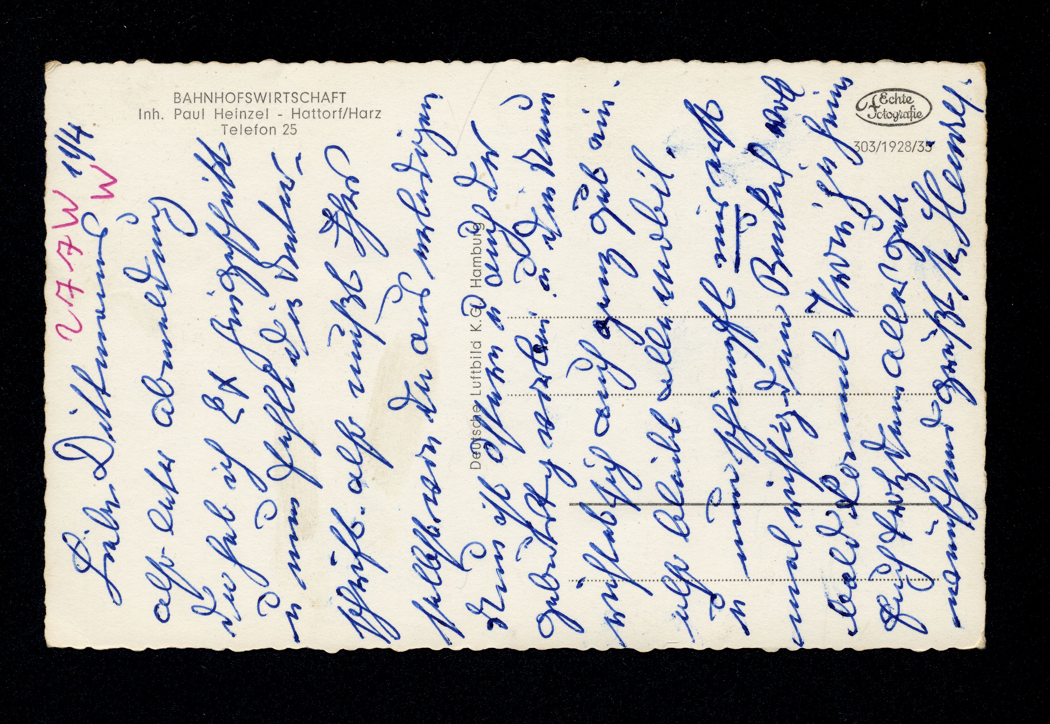 Ort Hattorf Motive Bahnhofswirtschaft Inh. Paul Heinzel Format klein Verlag Deutsche Luftbild K.G., Hamburg Bestell- oder Individualnummer 303/1928/35 Tags Bahnhof Luftbild