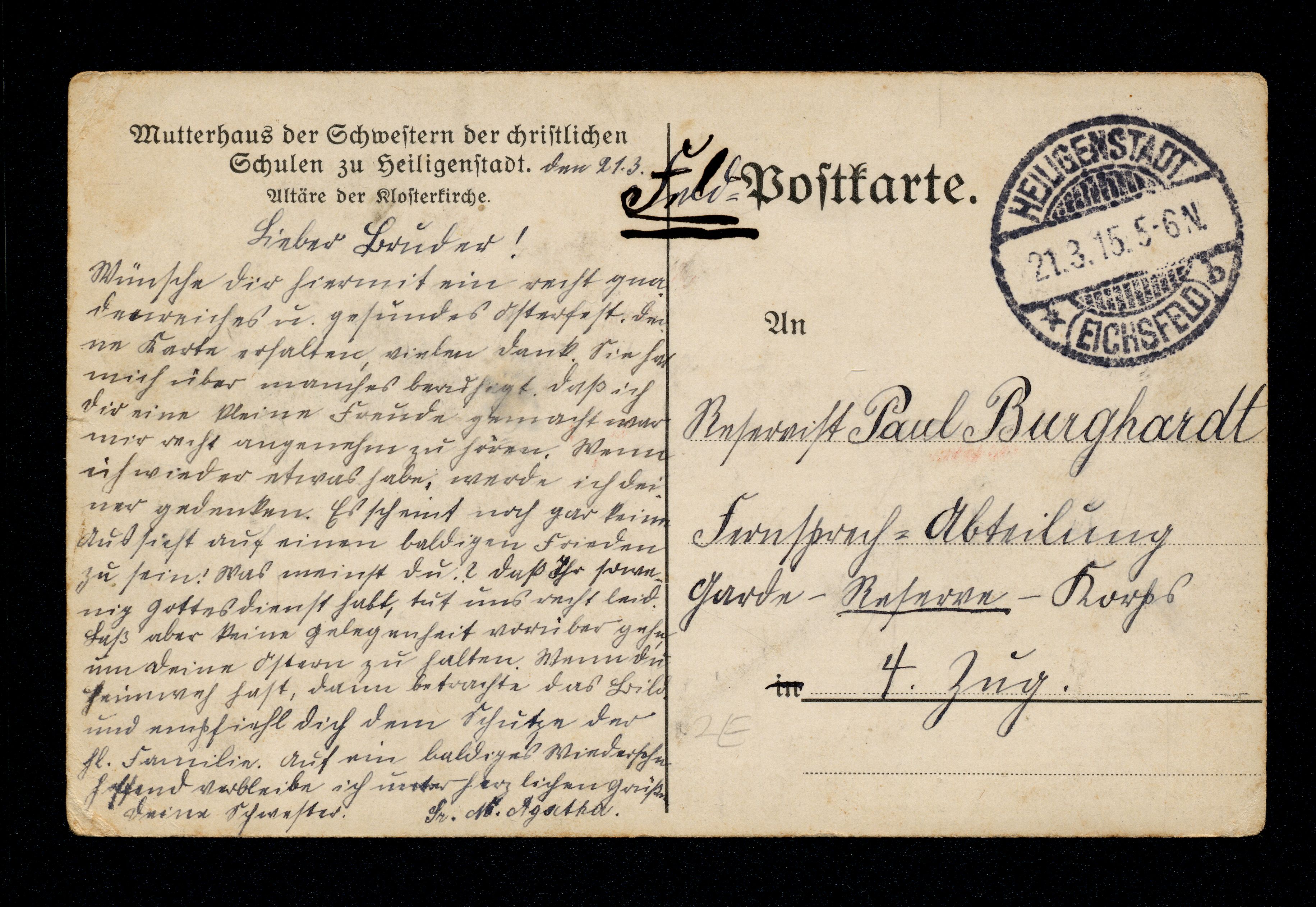 Ort Heiligenstadt Motive Mutterhaus der Schwestern der christlichen Schulen zu Heiligenstadt Altäre der Klosterkirche Format klein Jahr 1915 Verlag - Bestell- oder Individualnummer - Versanddatum 21.03.1915 Tags Feldpost