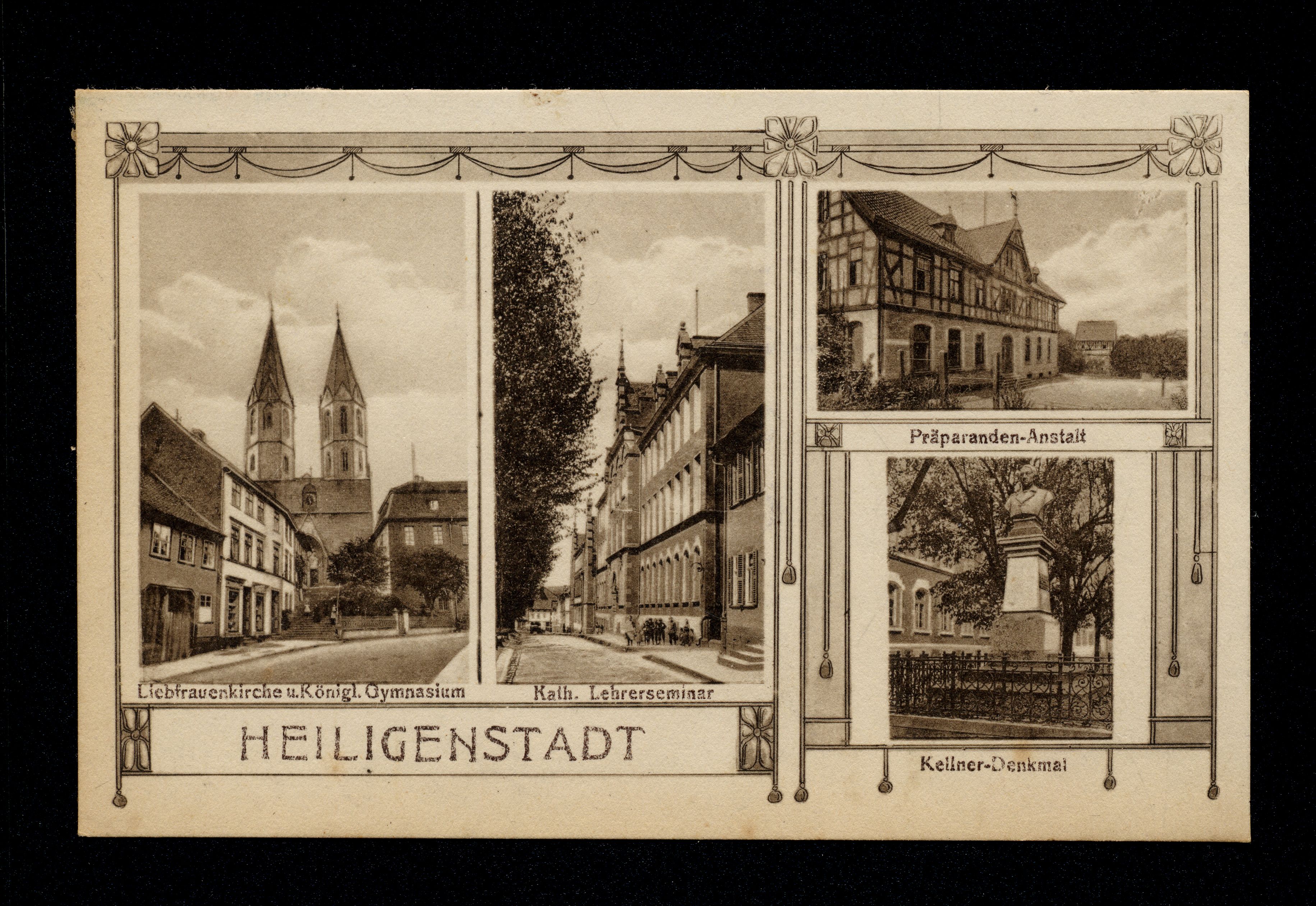 Ort Heiligenstadt Motive Liebfrauenkirche u. Königl. Gymnasium Königl. Lehrerseminar Präparanden-Anstalt Kellner-Denkmal Format klein Jahr 1917 Verlag Albert Multhauf, Heiligenstadt Bestell- oder Individualnummer 7512 1. 17. 33063