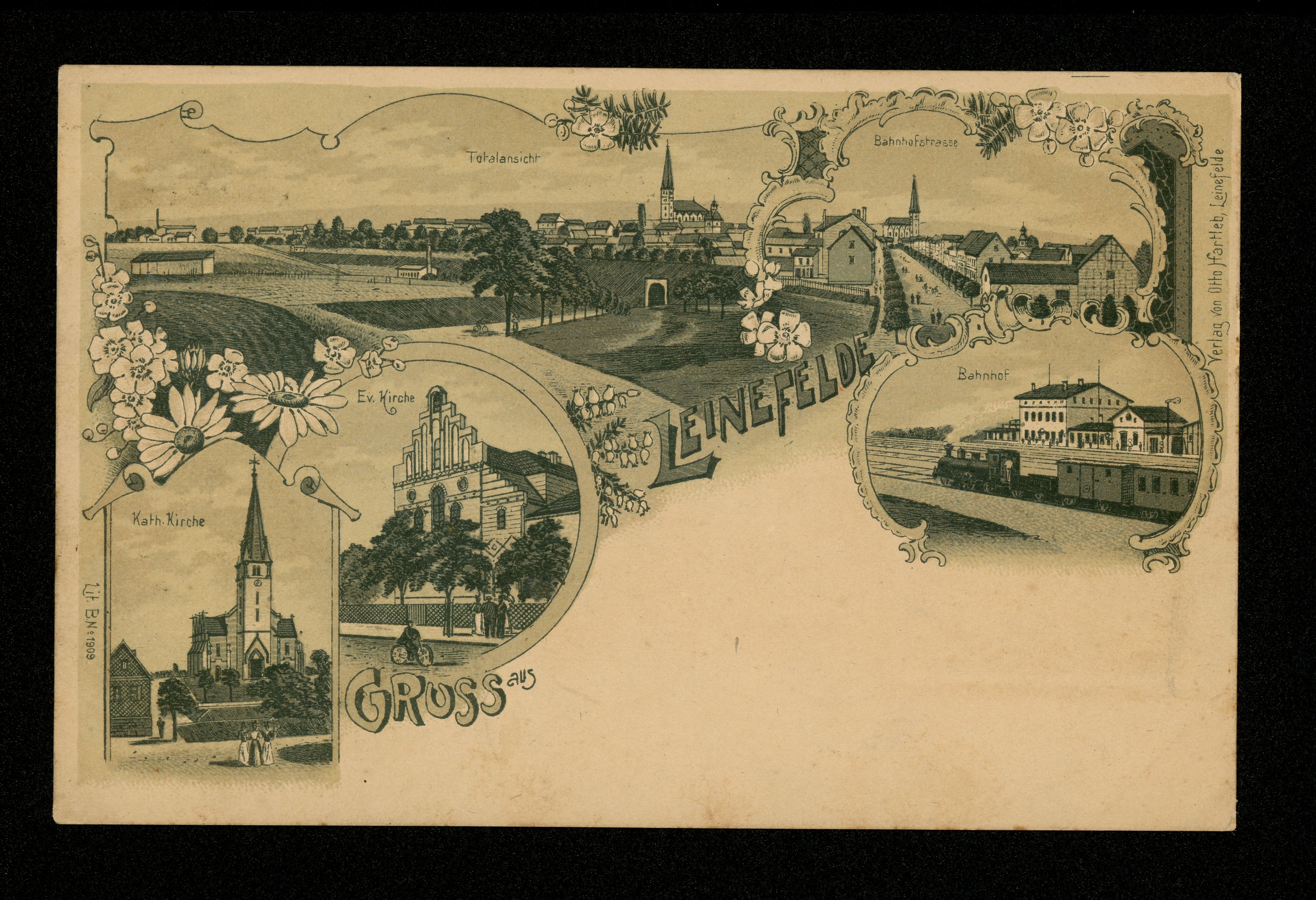 Ort Leinefelde Beschreibung Variante "braun" Motive Totalansicht Kath. Kirche Ev. Kirche Bahnhof Bahnhofstrasse Format klein Verlag Otto Hartleb, Leinefelde Bestell- oder Individualnummer Lit. B. No. 1909 Tags Eisenbahn