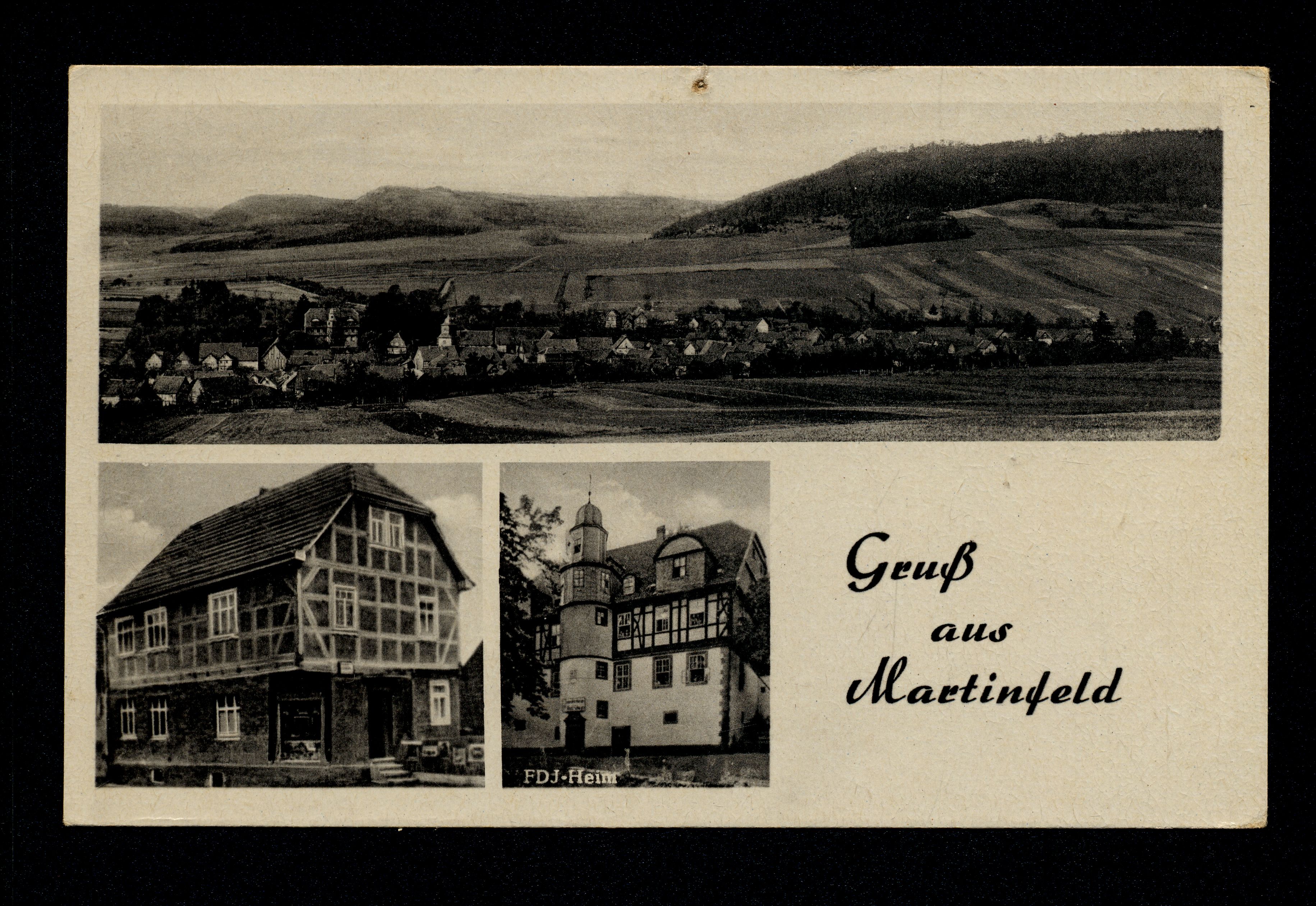 Ort Martinfeld Motive Panorama FDJ-Heim Kolonialwarengeschäft von Johannes Gödecke Format klein Verlag Karl Althaus, Ershausen Bestell- oder Individualnummer IV 14 45 Za 816 32-751 Tags Schloss Martinfeld