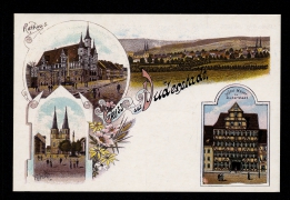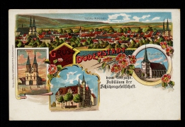 Spiegelbrücke mit Westerthurm, Ursulinen-Kloster, Bahnhofstr. m. evang. Kirche, Rathhaus, Panorama, Kath. Probstei-Kirche mit Schule |