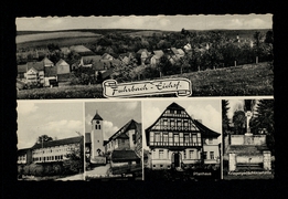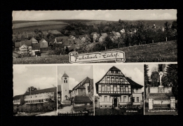 Panorama, Schule, Kirche mit neuem Turm, Pfarrhaus, Kriegergedächtnisstätte |