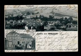 Totalbild, Gastwirtschaft zum ''Deutschen Hause'', Ant. Müller, Partie am Ochsenberge, Colonialwarenhandlung Franz Henkel |