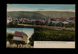 Gast- und Pensionshaus >Zur Sonne<, Waldpartie, Kirche, Ortspartie |