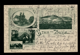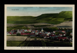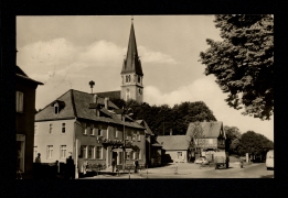 Totalansicht und Asenburg, Teil der Dorfstr., Materialwarenhandlung u. Bäckerei v. Aug. Brandt, Der Ritterkeller, Gasthaus zum drei Linden v. Jos. Petri |