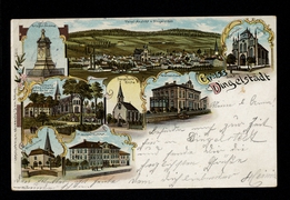 Krieger-Denkmal, Total-Ansicht v. Dingelstädt, Gertruden-Kirche, Krankenhaus, Evangelische Kirche, Kerbsche Berg m. Franziskaner Kirche und Kloster, Marienkirche, St. Joseph-Institut |